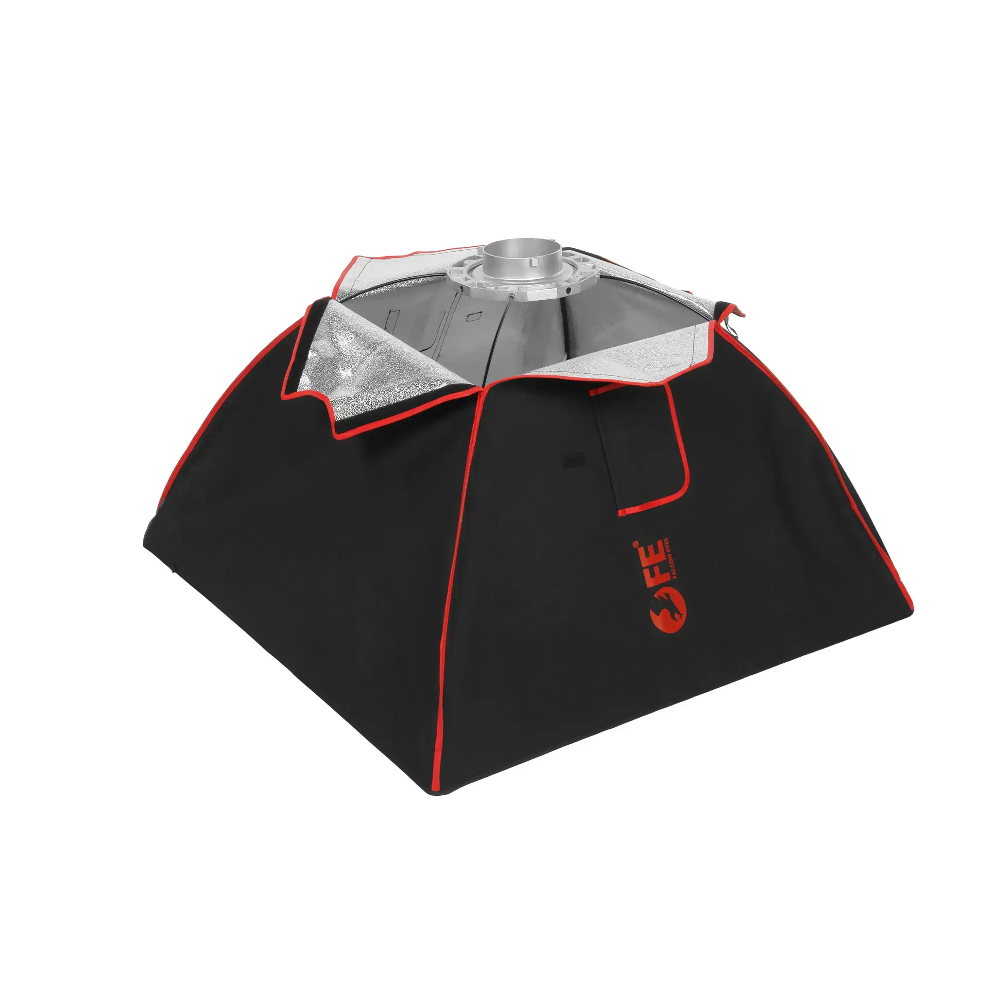 Каркас софтбокса выполнен из качественной жаропрочной синтетической ткани с серебристой поверхностью, рассчитанной на длительную эксплуатацию при интенсивной работе в студии. Плотная ткань каркаса позволяет избежать нежелательных бликов и потерь светового потока, что бывает заметно у софтбоксов нежаропрочного типа (особенно в зоне крепления источника света).