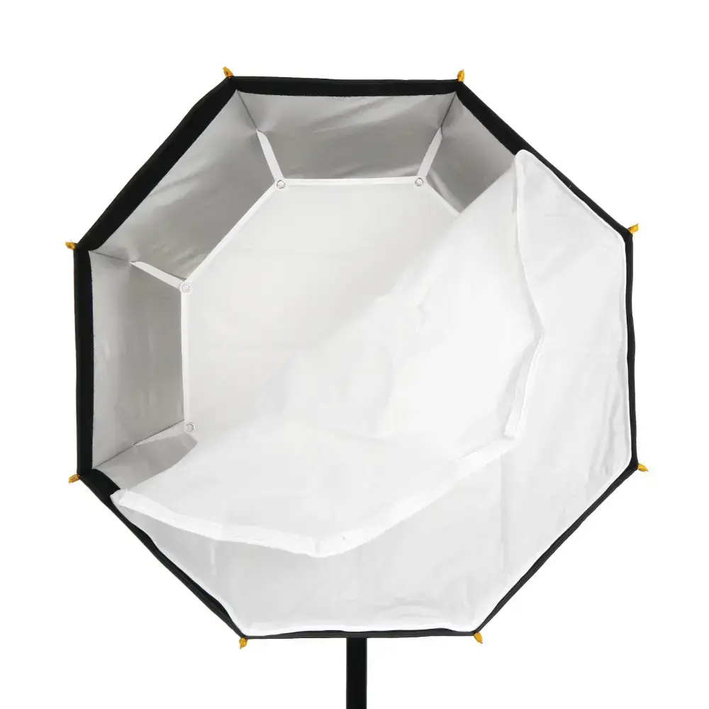 Купол софтбокса изготавливается из специальной синтетической ткани с серебристой светоотражающей поверхностью (производство Южная Корея). Восемь упругих металлопластиковых спиц прикреплены к кольцу адаптеру с одной стороны и надежно вшиты внутрь купола с другой. Разворачивание зонта происходит заведением спицы до щелчка в специальный паз на кольце-адаптере. Складывается софтбокс поочередным нажиманием 8 металлических подпружиненных кнопок на кольце-адаптере.