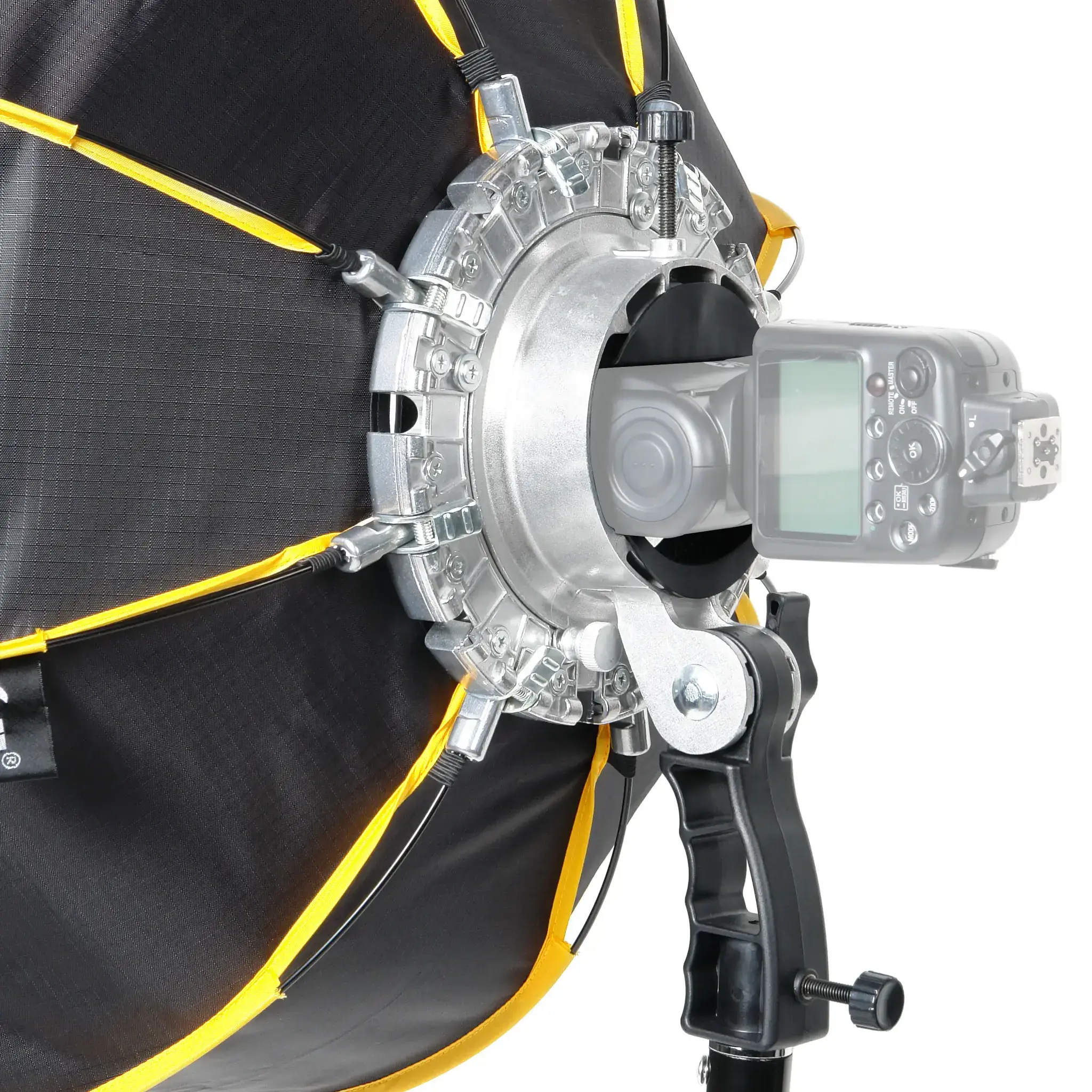 Съемный литой металлический адаптер служит для установки вспышки, которая надежно фиксируется в нем металлическим винтом с резиновой пяткой. К адаптеру прикреплена удобная рукоятка, в нижней части которой расположено отверстие для крепления к телескопическому держателю и фиксирующий винт. Софтбокс можно использовать не только с накамерной вспышкой, но и с любым другим источником света со стандартным байонетом. Для этого металлический адаптер с держателем для накамерной вспышки меняется на адаптер соответствующего байонета (в комплект не входит) с посадочным диаметром кольца 130 мм.