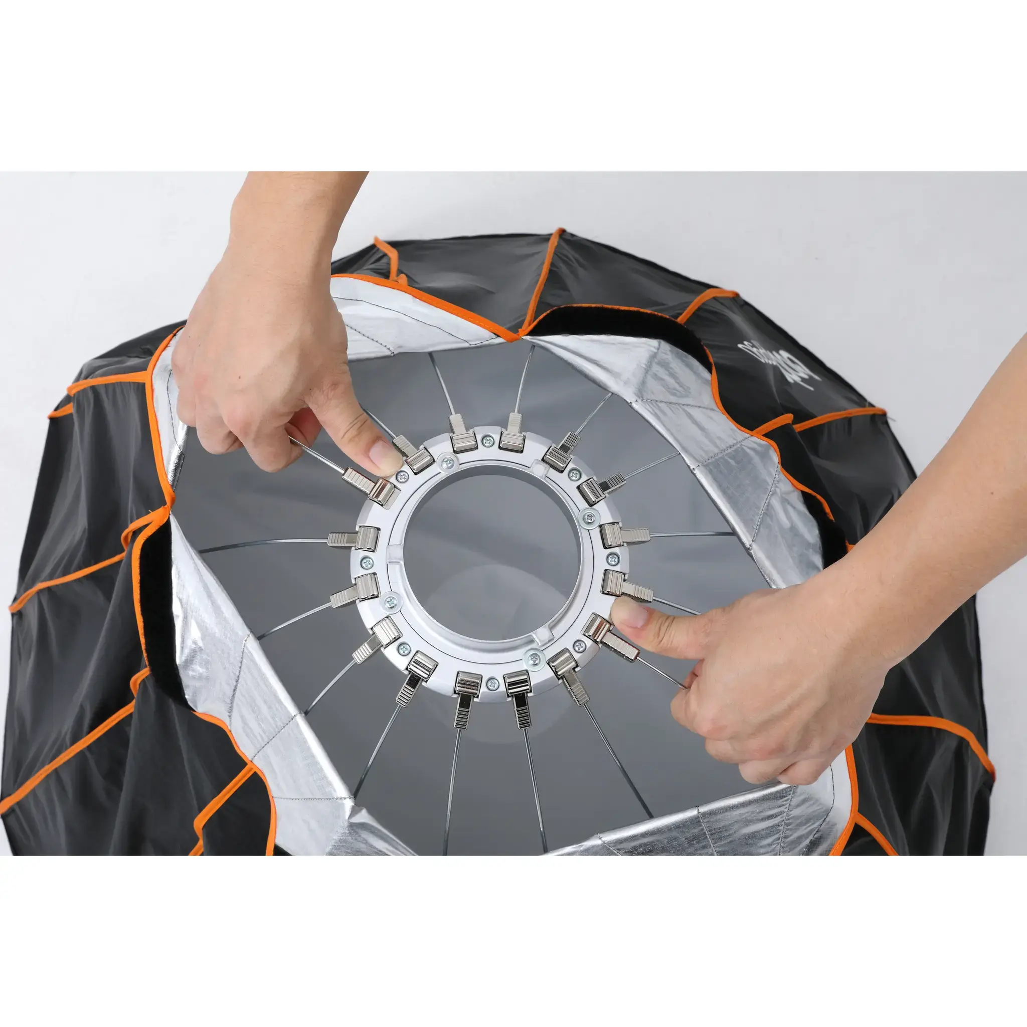 Прочная металлическая конструкция каркаса предназначена для многократной сборки и разборки – быстрой подготовки оборудования к съемке и такого же скорого сворачивания. Чтобы привести софтбокс в рабочее состояние достаточно слегка приподнять спицы над установочным кольцом. Для ускорения процесса сборки, можно поднимать по две спицы, расположенные на противоположных сторонах кольца, одновременно. После проведения съемки, необходимо приподнять спицу и нажать на кнопку, после чего софтбокс сложится.