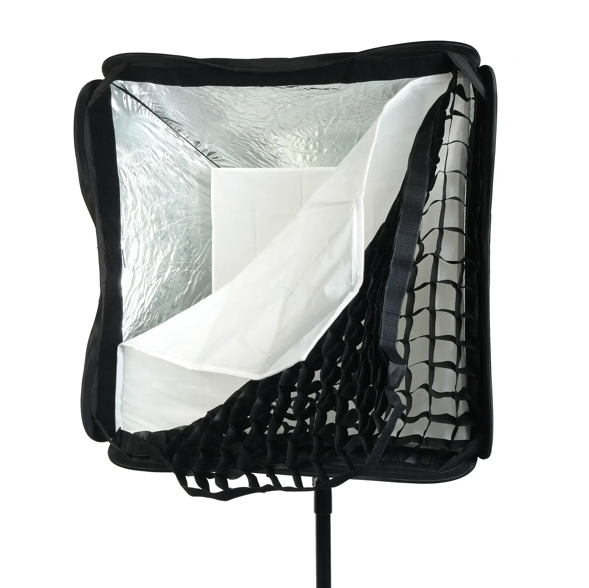 Конструкция глубокого софтбокса разработана таким образом, чтобы даже небольшой мощности вспышки было достаточно для полного заполнения его светом. Серебристая отражающая поверхность софтбокса обеспечивает равномерное освещение и создает направленный поток света на выходе. Два рассеивателя (внутренний и внешний) помогают получить мягкий и равномерный световой поток. Внутренний рассеиватель крепится к эластичной ленте внутри софтбокса, а внешний – к козырьку софтбокса с помощью ленты- липучки. Рядом с внешним рассеивателем на липучку прикрепляются тканевые соты. Соты используют для формирования плавного перехода от центра светового пятна к краю, что дает возможность лучше контролировать освещенность деталей объекта и избегать резких теней.