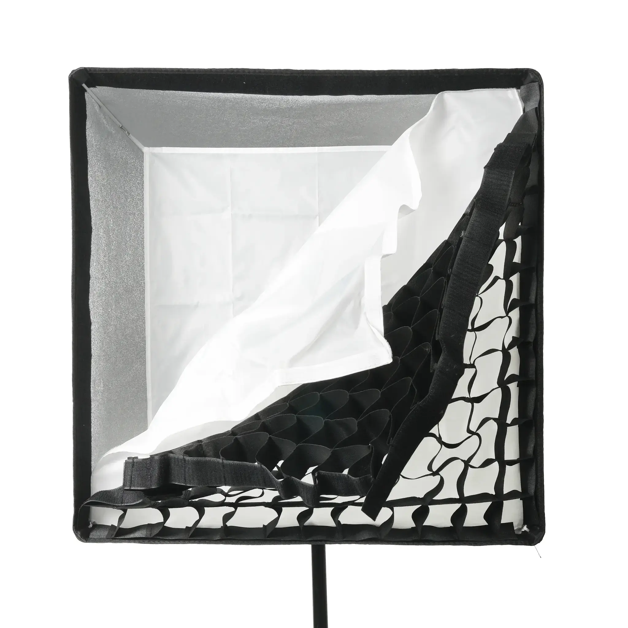 Закрытая конструкция исключает паразитные блики и потери светового потока. Отражающая серебристая поверхность обеспечивает равномерное распределение света внутри софтбокса, белые полупрозрачные рассеиватели делают свет более мягким.
