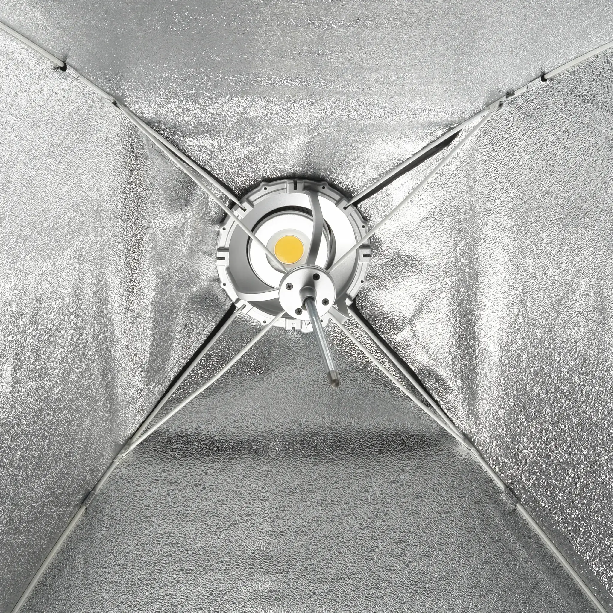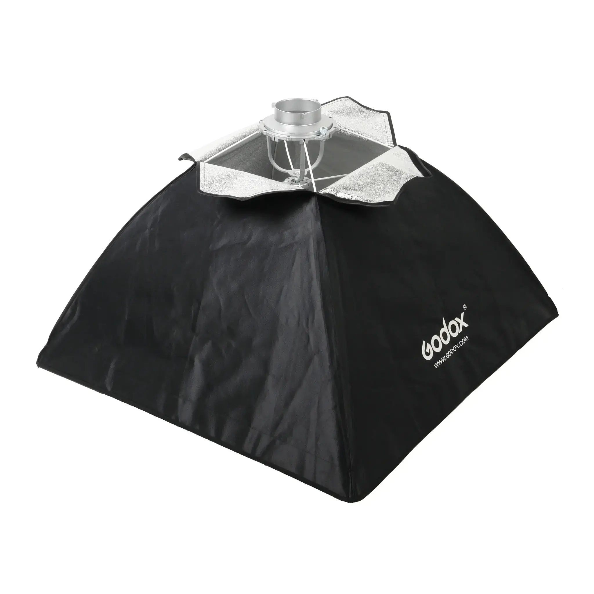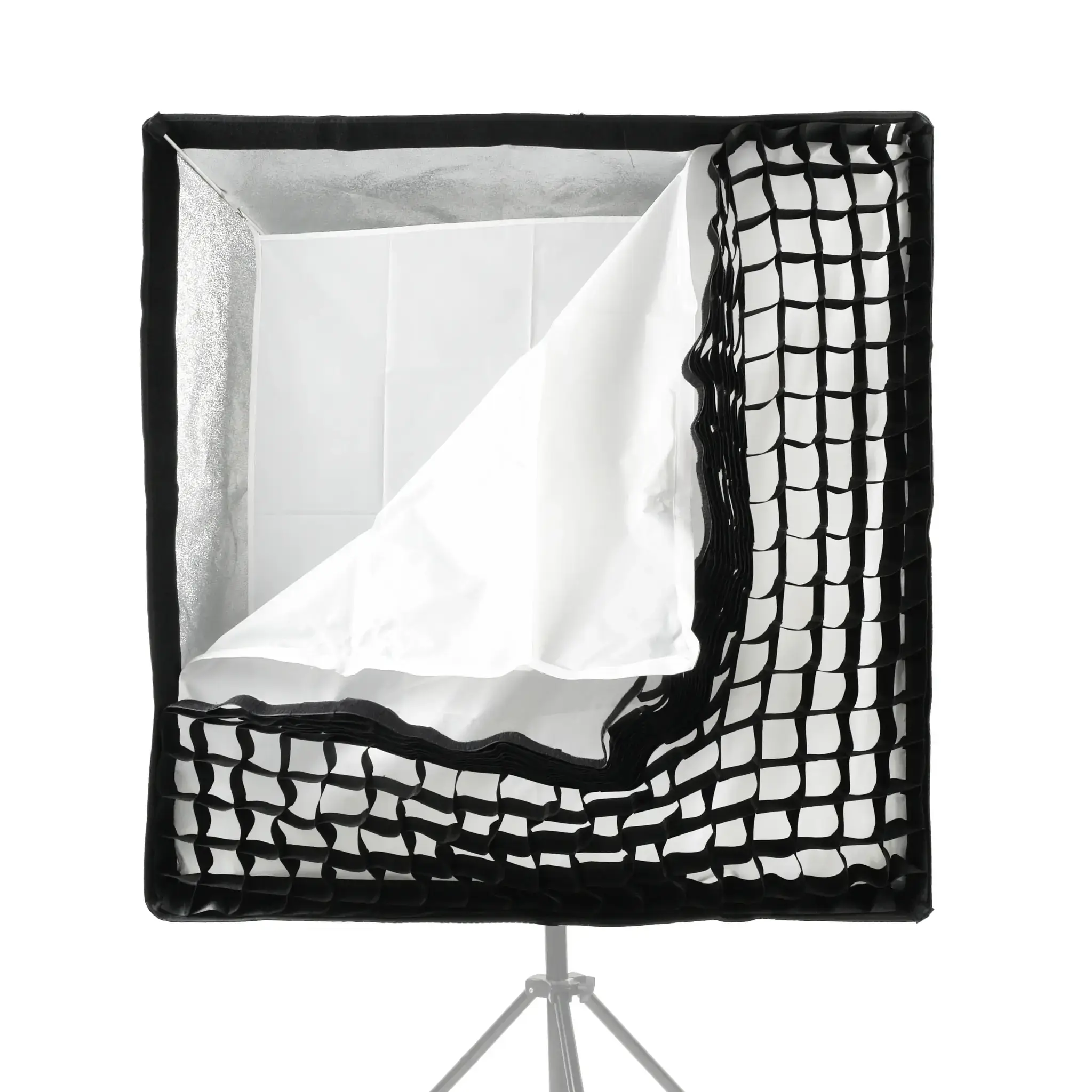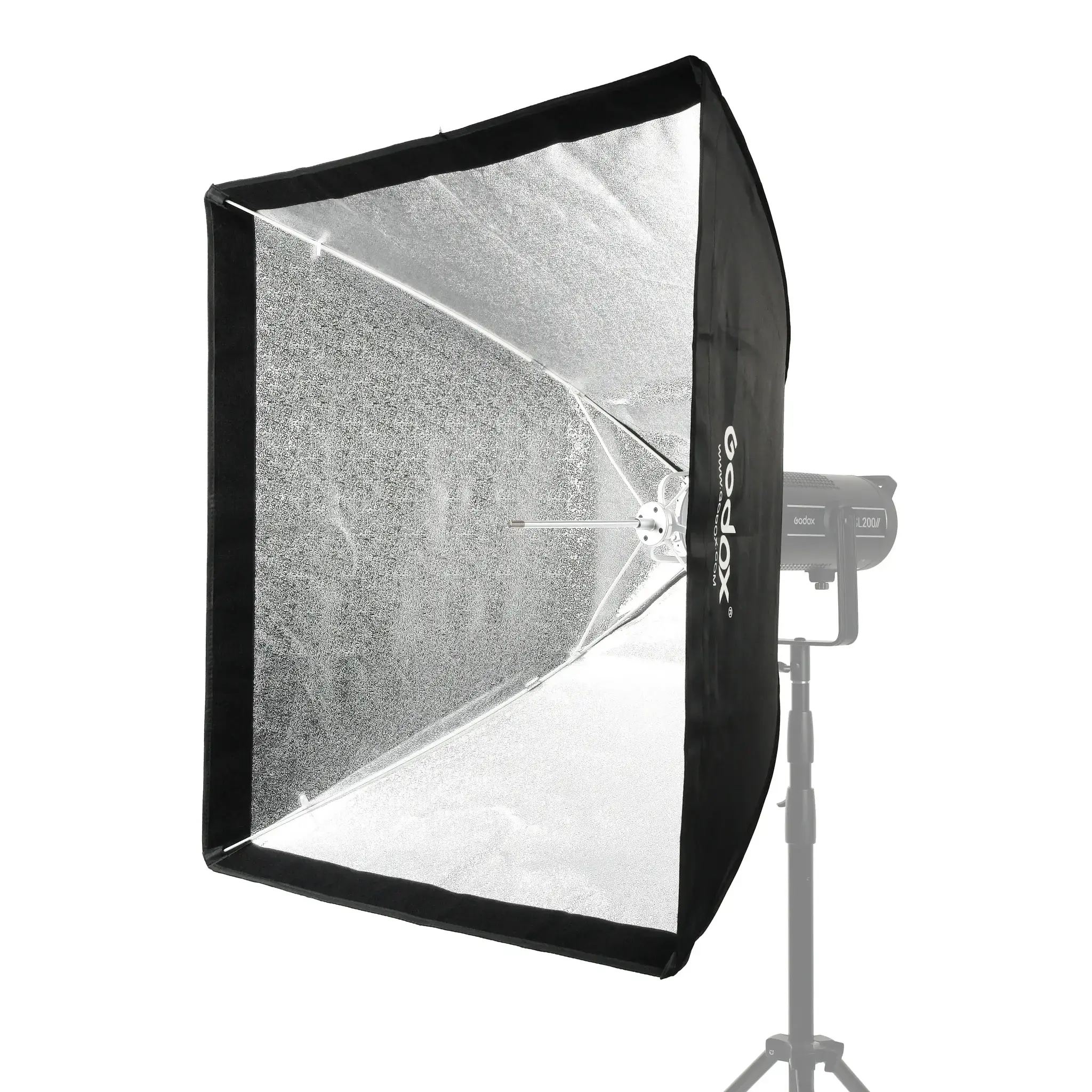 Закрытая конструкция исключает паразитные блики и потери светового потока. Отражающая серебристая поверхность обеспечивает равномерное распределение света внутри софтбокса, белые полупрозрачные рассеиватели делают свет более мягким.