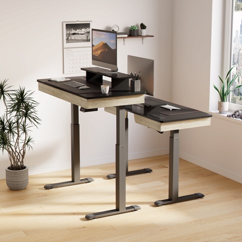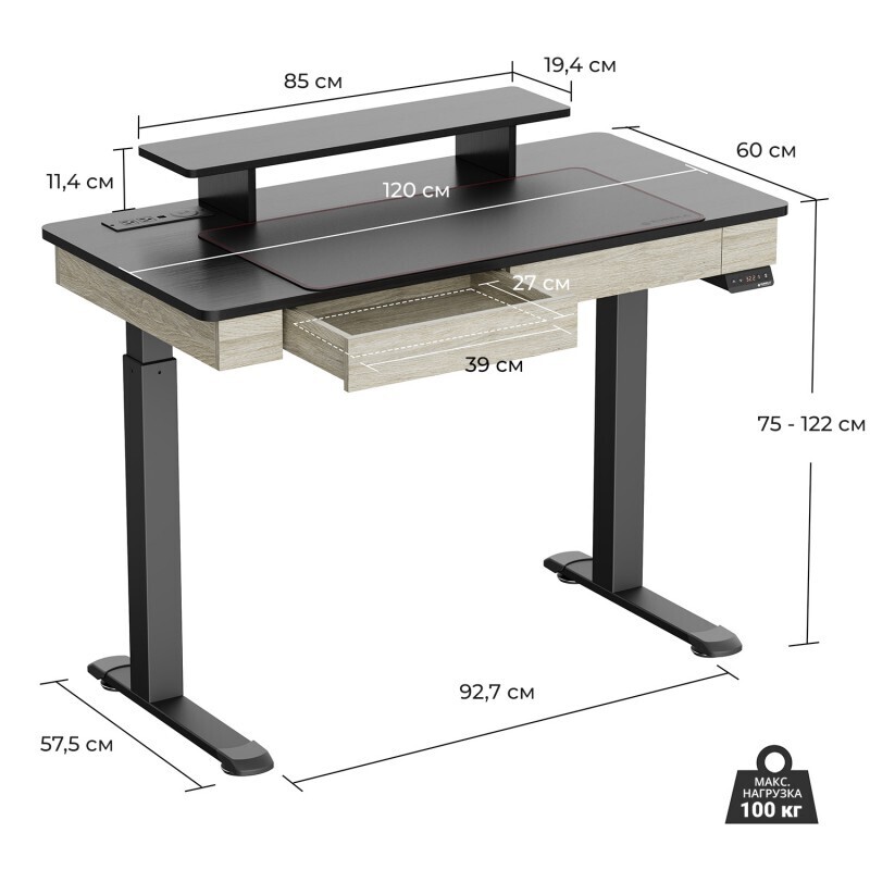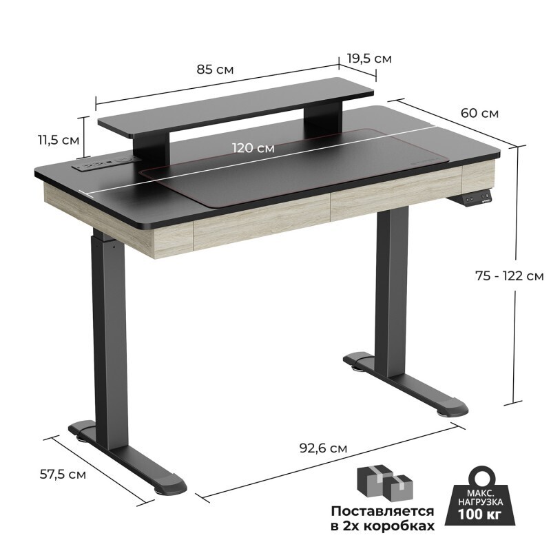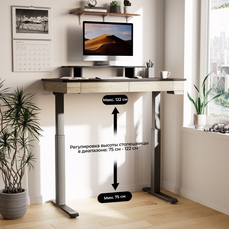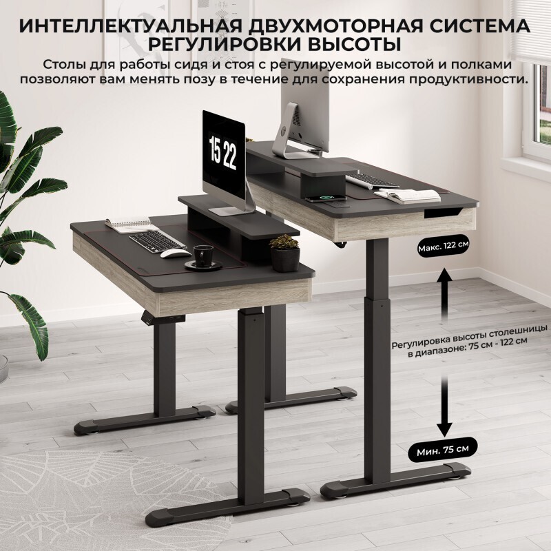 - Эргономичный стол для работы стоя: регулируемая высота в диапазоне 75 - 122 см при помощи двух электродвигателей для быстро изменения положения со скоростью 2,5 см/с при нагрузке на столешницу до 100 кг