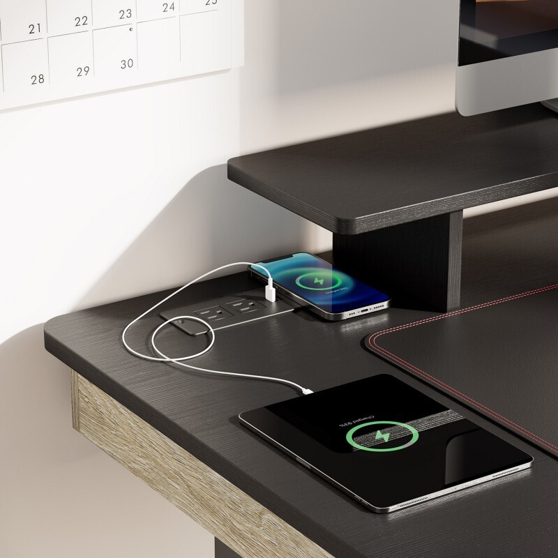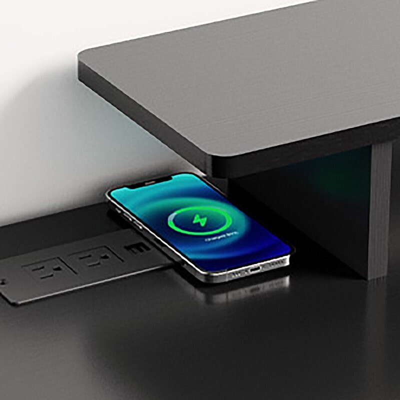 - Простая зарядка: встроенный в столешницу блок розеток с двумя USB-разъёмами, двумя сетевыми розетками и быстрой беспроводной зарядкой 10 Вт;