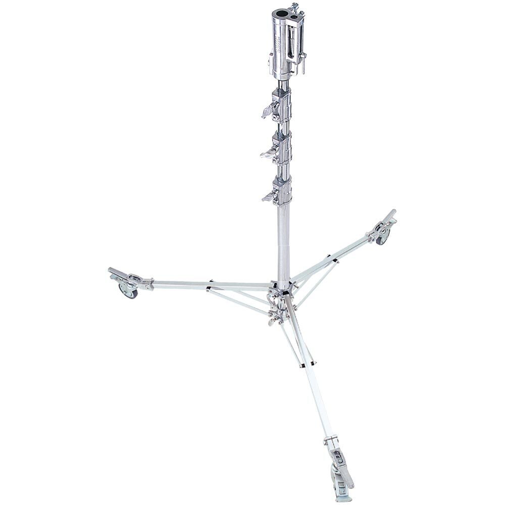 Каждая секция оборудована пружинной амортизацией для защиты осветительных приборов от внезапного падения в случае ослабления стопорного хомута. Цельнолитая алюминиевая рукоятка в сочетании с нержавеющим винтом обеспечивает надежную и долговечную работу. Литое основание оснащено вставкой Helicoil из нержавеющей стали, обеспечивающей прочное резьбовое соединение. Верхняя часть основания оснащена крючком для удобного хранения на стеллаже. Кроме того, на стойке предусмотрена проушина для установки комплекта ветрозащиты (приобретается отдельно). Каждая нога стойки оснащена накладкой для ног из полиамида PA66, защищающей как ногу, так и поверхность пола. Кроме того, ноги оснащены большими тормозными педалями для быстрой и надежной фиксации. В комплект входят колеса, облегчающие перемещение осветительных приборов в студии или на локации.