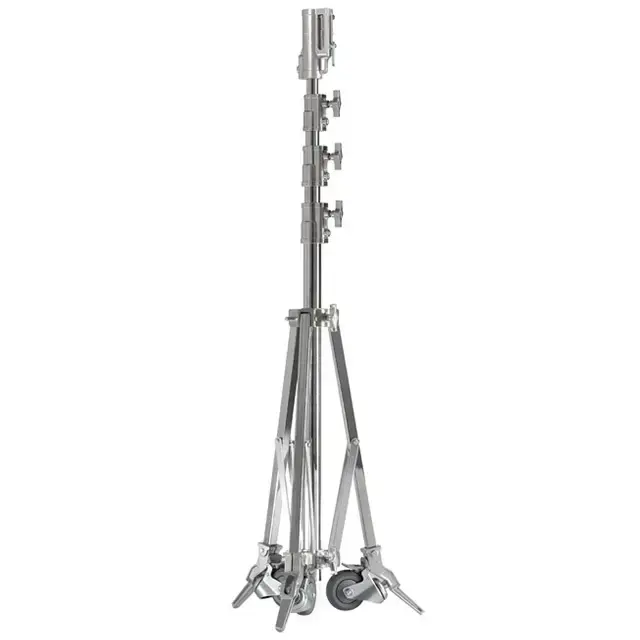 KUPO 300MH HIGH JUNIOR ROLLER STAND – четырехсекционная стальная стойка для цифровых фото и видеокамер с максимальной рабочей высотой до 428 см. Головка с гнездами 1-1/8" (28 мм) и 5/8" (16 мм) и наклонным штифтом 5/8" (16 мм) с шаровой головкой служит для крепления цифровой камеры. Стойка выдерживает нагрузку до 40 кг, а ее максимальная рабочая высота составляет 4,28 м. Каждая секция стойки с пружинной амортизацией для защиты от внезапного падения в случае ослабления стопорного хомута. Цельнолитые алюминиевые рукоятки с нержавеющим винтом обеспечивают надежную фиксацию секций. Отверстия фиксаторов в литых крестовинах основания со вставкой Helicoil из нержавеющей стали, обеспечивающей прочное резьбовое соединение. Верхняя часть основания с крючком для удобного хранения на стеллаже. Кроме того, на стойке предусмотрена проушина для установки комплекта ветрозащиты (приобретается отдельно). Ноги оснащены большими тормозными педалями для быстрой и надежной фиксации колес. В комплект входят 3 колеса, облегчающие перемещение стойки.