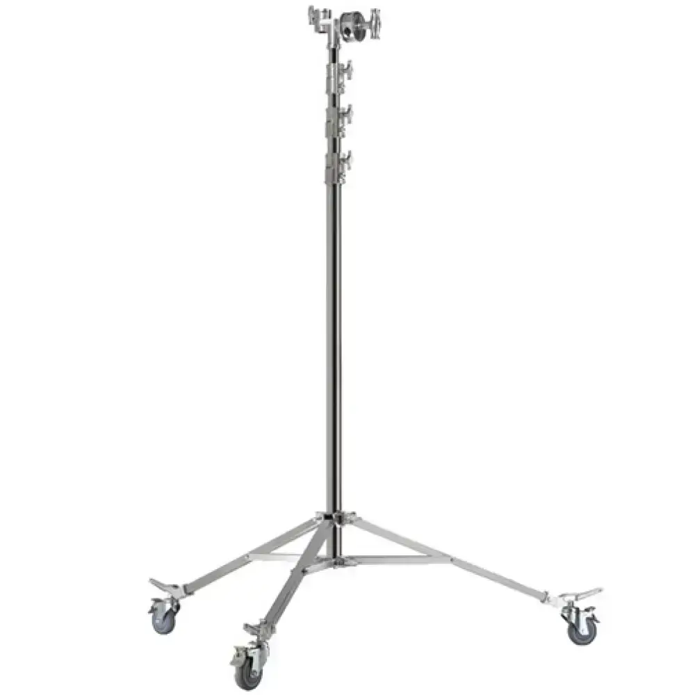 Стойка на колесах KUPO 610MRH MEDIUM OVERHEAD ROLLER STAND позволяет поднять оборудование на впечатляющую высоту до 4,3 м. Разработанная специально для установки фрострам, эта стойка идеально подходит для решения сложных задач по установке оборудования на съемке. Комбинированная головка KUPO 610MRН включает в себя зажимную муфту диаметром 4,5" и гнездо Junior 1-1/8" (28 мм). Каждая секция стойки оснащена пружинной амортизацией, защищающей оборудование от удара при ослаблении стопорного винта. Прочная стальная конструкция обеспечивает максимальную грузоподъемность до 40 кг, а колеса с тормозами позволяют легко перемещать всю установку по студии. Суппорты колес оснащены удлиненными наконечниками, на которые стойку в сложенном состоянии можно поставить вертикально.