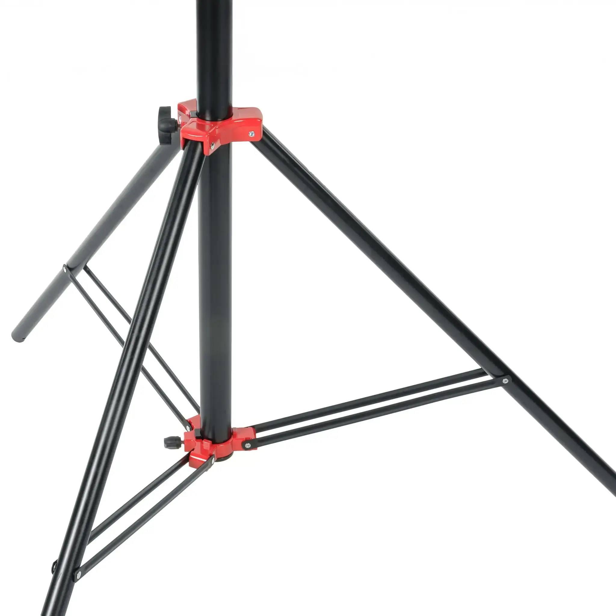 Основание стойки представляет собой складную треногу с двумя винтовыми фиксаторами. Первый фиксатор удерживает треногу в раскрытом положении, обеспечивая максимальный размах ног основания до 126 см и высокую устойчивость при установке оборудования. Второй фиксатор находится в нижней части центральной колонны и контролирует ее перемещение вверх-вниз относительно основания, позволяя точно подбирать нужную высоту и, при необходимости, создавать четвертую точку опоры.