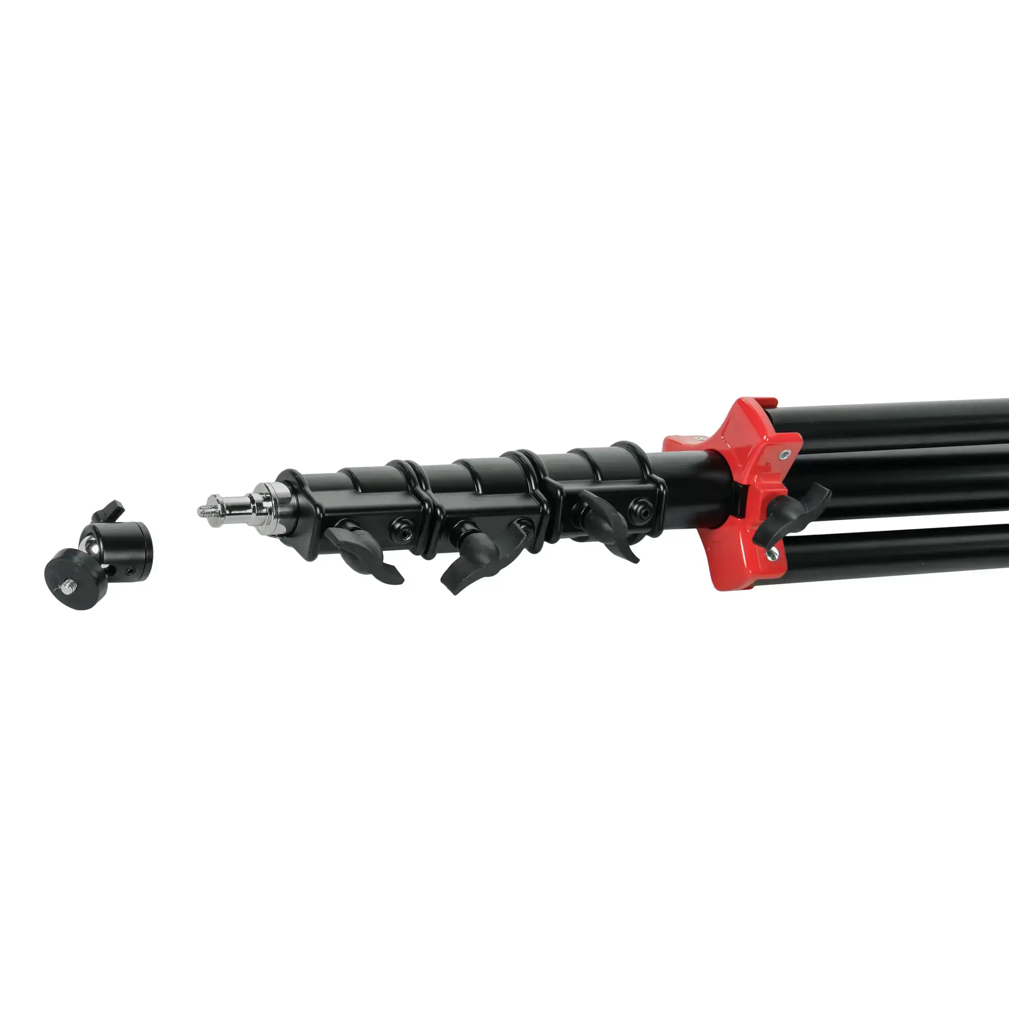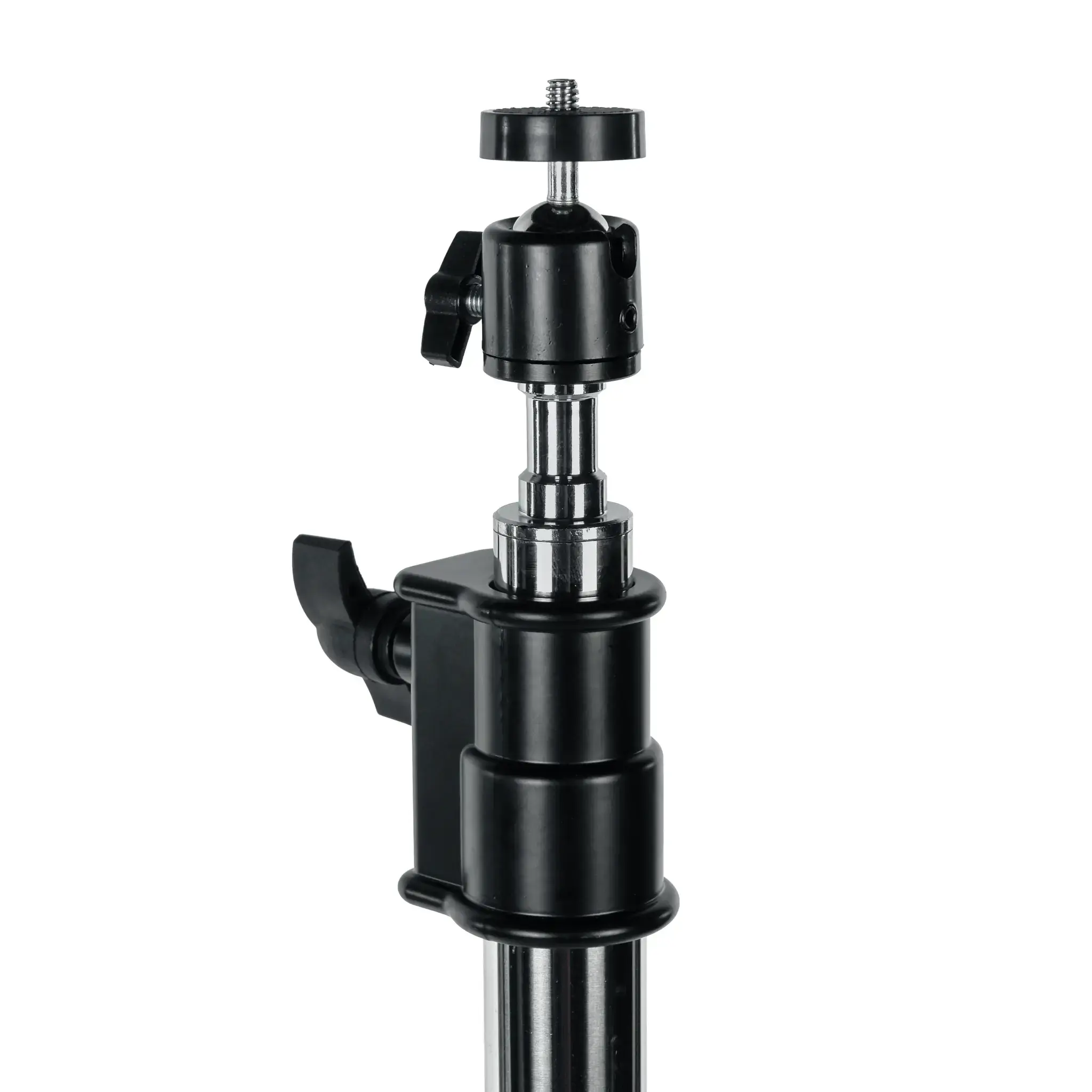 Фото- или видеокамеру можно установить на стойку с помощью универсального несъемного адаптера диаметром 5/8 дюйма (16 мм) с резьбовым соединением 1/4 дюйма. Для регулировки угла съемки используется шаровая мини-головка, позволяющая быстро настраивать наклон установленного оборудования и выбирать оптимальный ракурс.
