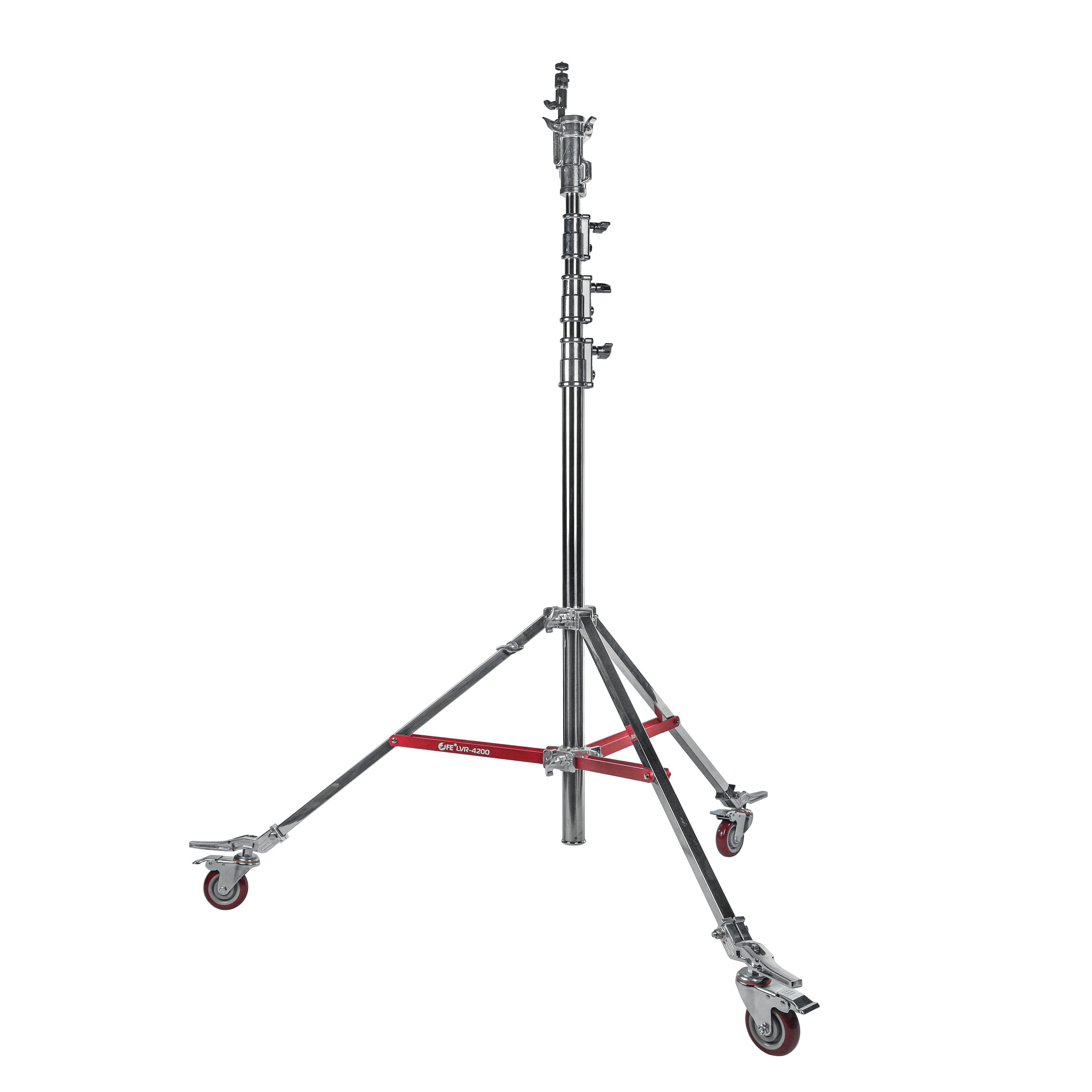 Четырехсекционная профессиональная стойка высотой 170-425 см с пружинной амортизацией выдерживает нагрузку до 30 кг. Для удобного перемещения по студии предусмотрены резиновые колеса с тормозным механизмом.