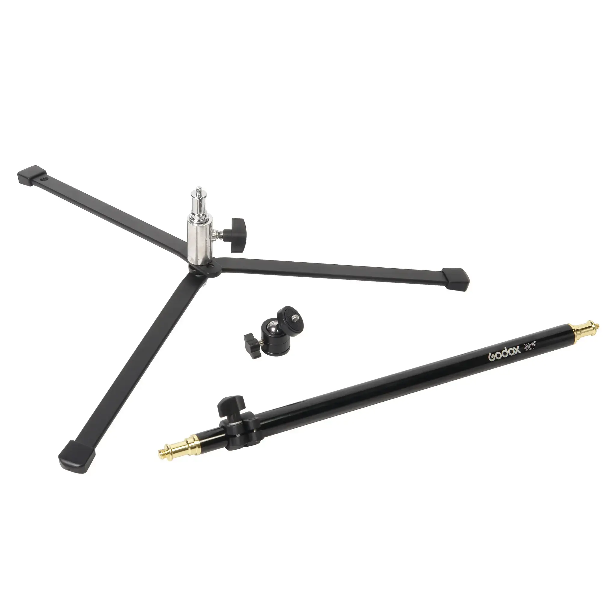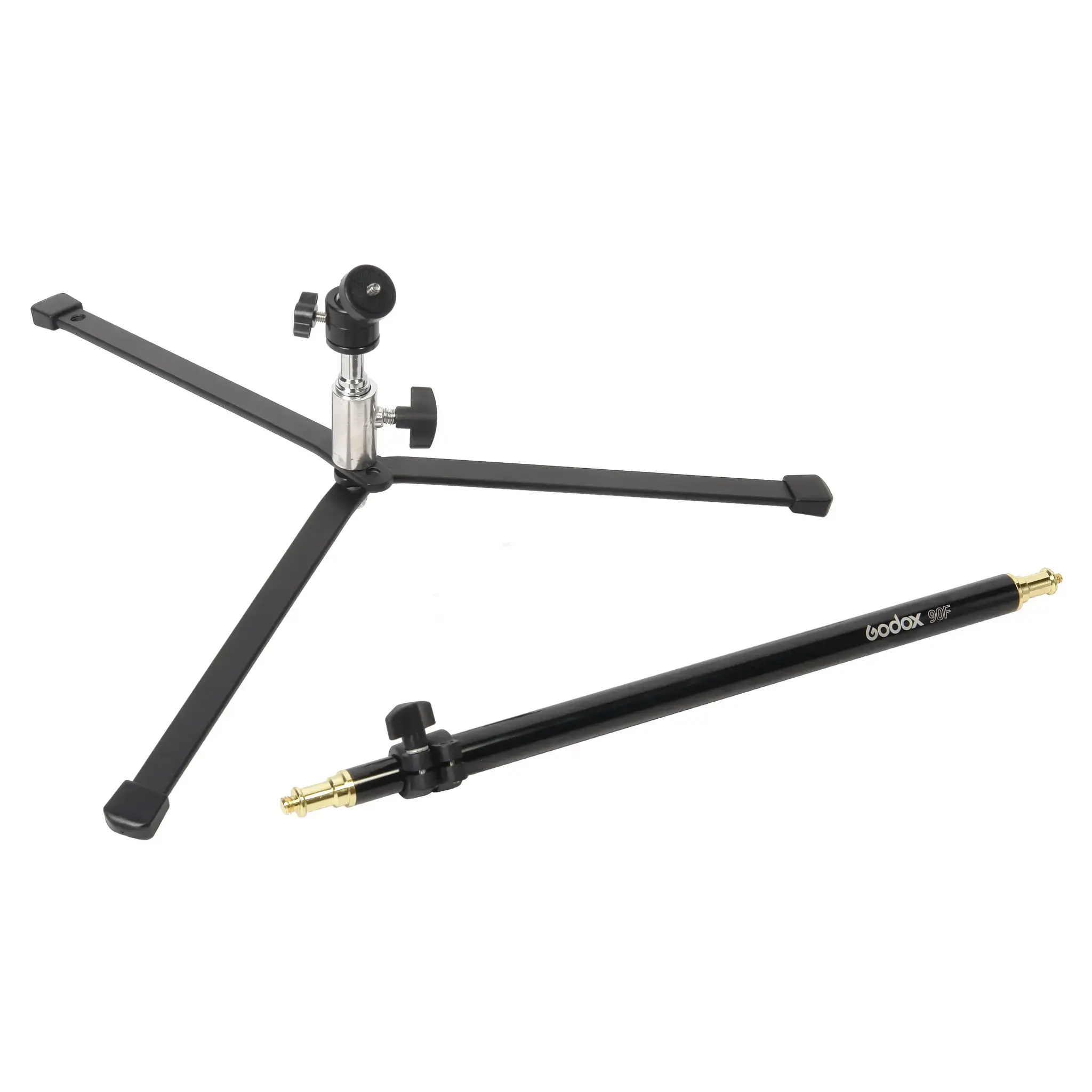 Godox 90F - компактная алюминиевая стойка-тренога с 2-секционной съемной телескопической центральной колонной, на конце которой закреплен несъемный латунный шпигот диаметром 5/8” с резьбой 1/4” и головкой для установки цифровых камер. Стойка предназначена для съемки с нижней точки в фото- или видеостудии, а также на выезде. Длина стойки в сложенном виде - 48.5 см, максимальная высота 88 см, вес 1.3 кг. Стойка выдерживает осевую (вертикальную) нагрузку до 3 кг.