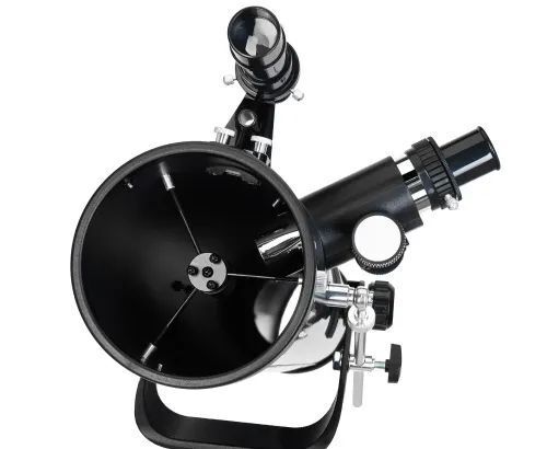 Главный элемент оптической системы Levenhuk Discovery Spark 767 AZ – зеркало сферической формы. Оптика сделана из стекла с антибликовым покрытием, благодаря чему формирует информативное изображение высокого качества. Вилочная азимутальная монтировка позволяет перемещать оптическую трубу телескопа по горизонтали и вертикали. Высокую точность настройки и плавность наведения обеспечивает микровинт, которым дополнена вертикальная ось. В наведении на астрономические объекты также помогает комплектный искатель.