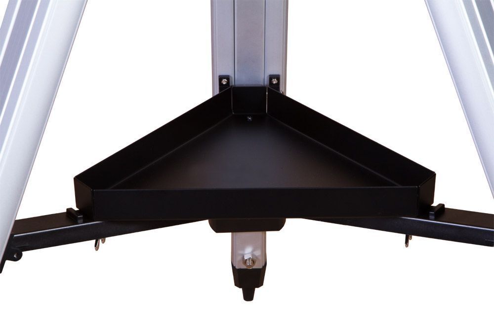 Оптическая труба управляется при помощи экваториальной монтировки. Она устроена несколько сложнее, чем азимутальная, зато позволяет точно и без усилий вести космические объекты по небосклону. На освоение потребуется время, зато качество и удобство наблюдений вас не разочаруют. Монтировка крепится на алюминиевой треноге, высоту которой можно адаптировать под рост наблюдателя. На треногу устанавливается лоток для аксессуаров.