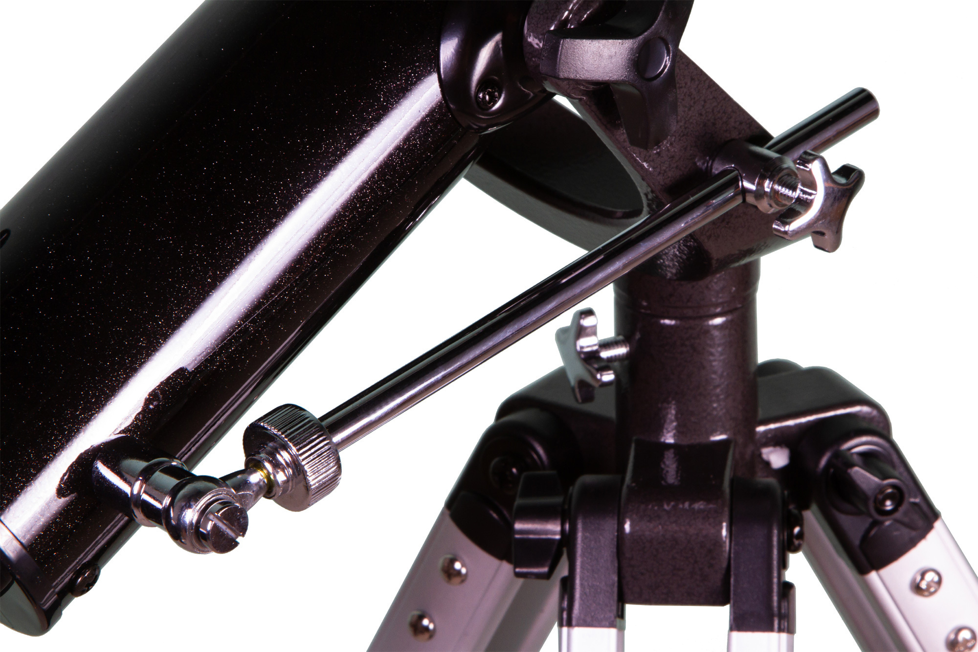 Азимутальная монтировка AZ2 – это простая вилочная монтировка с микровинтом на вертикальной оси и стопорными винтами на обеих осях. Телескопом, оснащенным AZ2, легко управлять – с наведением справится даже ребенок. Тренога алюминиевая с регулировкой высоты. В центре треноги располагается лоток для аксессуаров, на котором можно размещать все необходимые для наблюдений принадлежности.