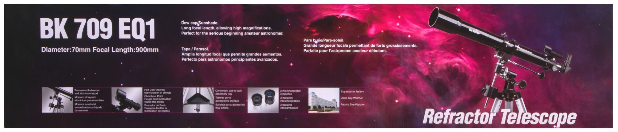 Sky-Watcher Capricorn AC 70/900 EQ1 – ахроматический рефрактор для наблюдения ближнего космоса и наземных объектов. Этим телескопом очень легко управлять, он не требует сложной настройки и юстировки, поэтому понравится начинающим астрономам. Возможности оптики лучше всего подходят для исследования Луны и планет земной группы, но отдельные объекты дальнего космоса тоже можно рассмотреть, хотя и без особых деталей.