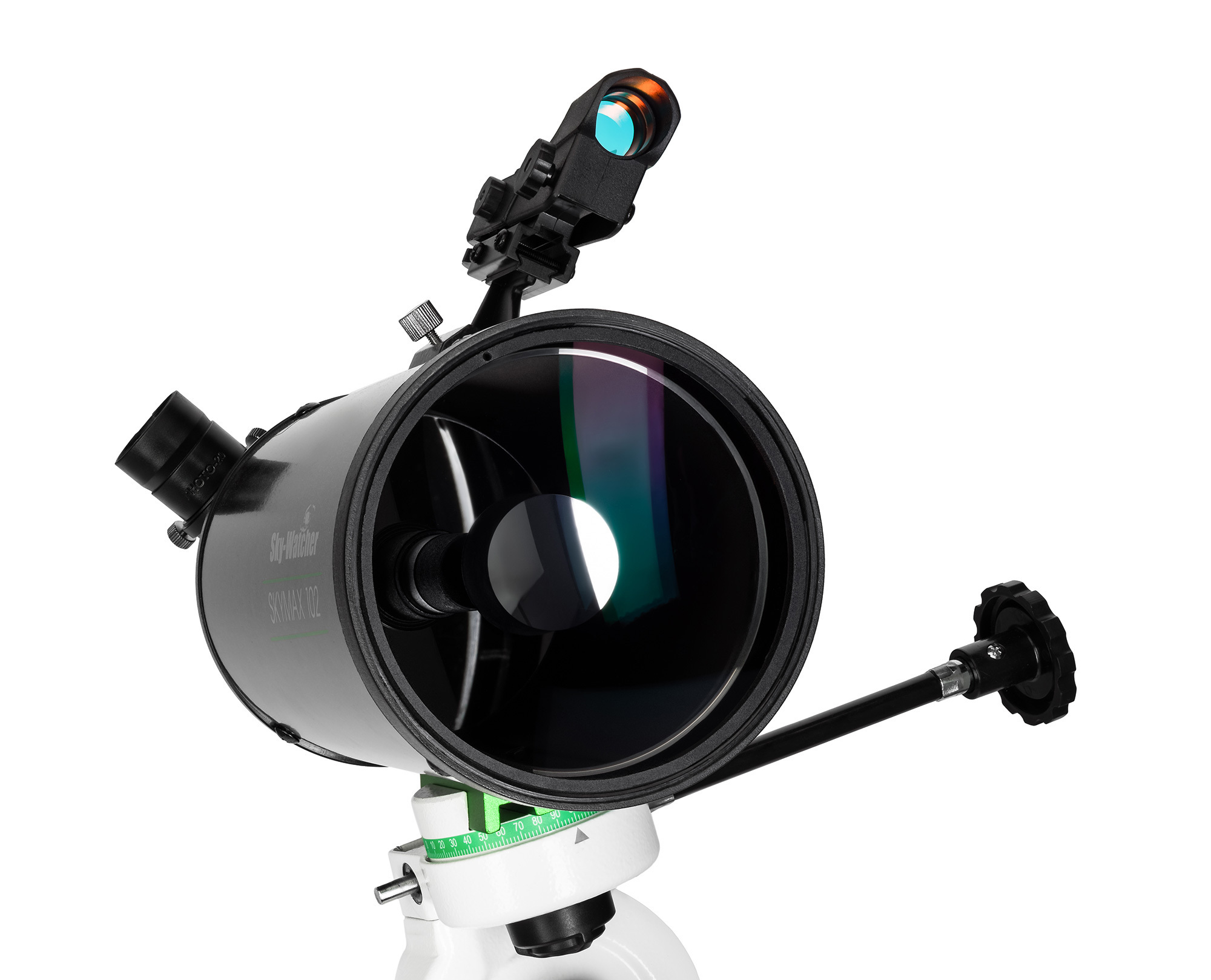 Sky-Watcher MAK102 StarQuest2 EQ2 отличается от аналогичных моделей наличием коллимационных винтов, помогающих в юстировке (выравнивании) оптической системы телескопа и налаживании соосности коррекционной линзы (мениска) с основным зеркалом. Винты также защищают телескоп от сбивания настроек при транспортировке, случайных несильных ударах и других легких механических воздействиях. Для эффективной работы в комплект поставки входит экваториальная монтировка Sky-Watcher EQ2 с ручным управлением через 2 ручки тонких движений, которую можно использовать как для обычных наблюдений, так и для приспособления к занятию астрофотографией. Вес монтировки составляет 1,4 кг, а максимальная нагрузка – 4,5 кг.