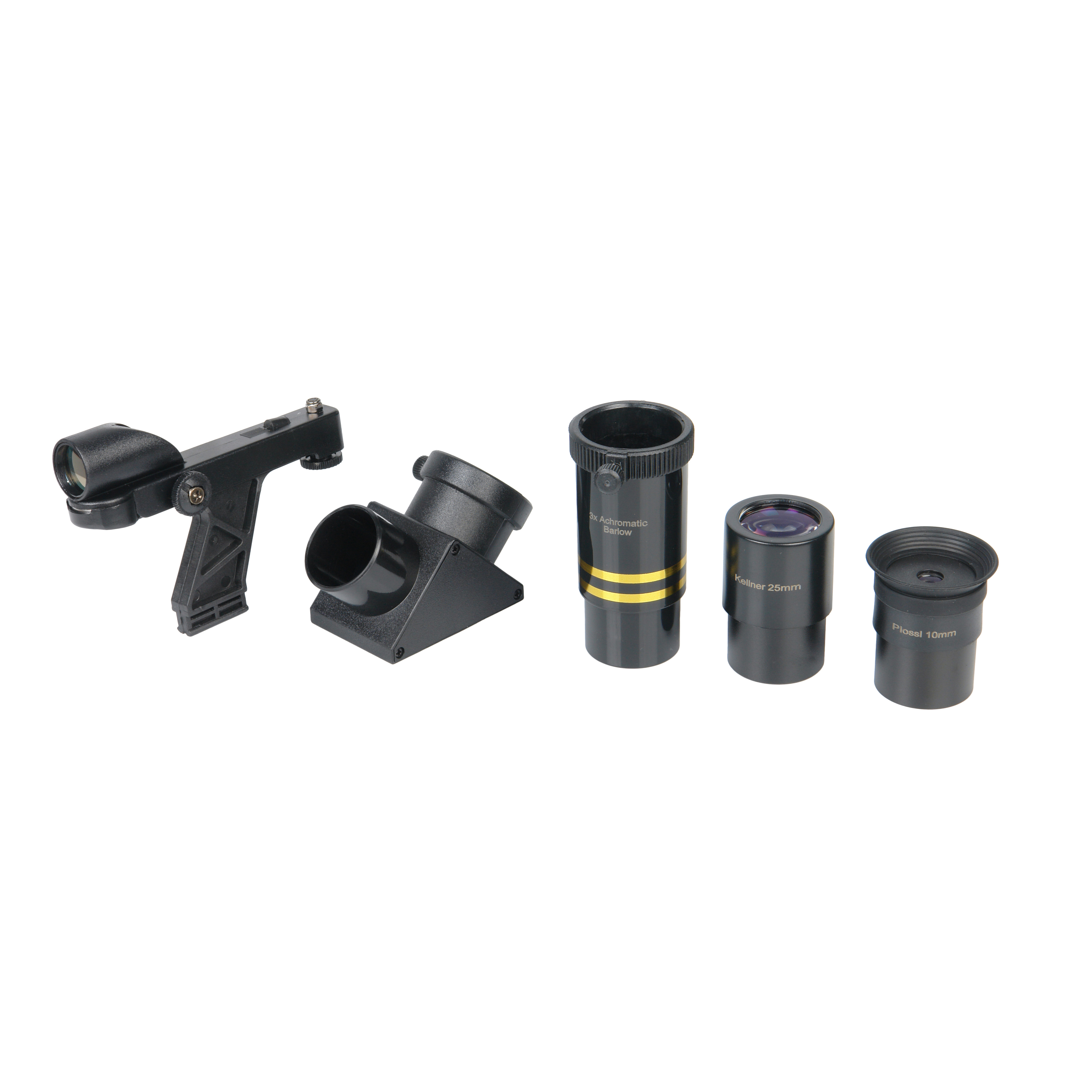 В комплект входят окуляры PL10 (симметричный окуляр Плёсл) и К25 (конструкция Кельнер) с просветленной оптикой FMC. Замена окуляров ведет к изменению кратности увеличения – 60х и 24х соответственно. Используя линзу Барлоу с трехкратным увеличением, можно кратно изменить увеличение до 180х, 72х.