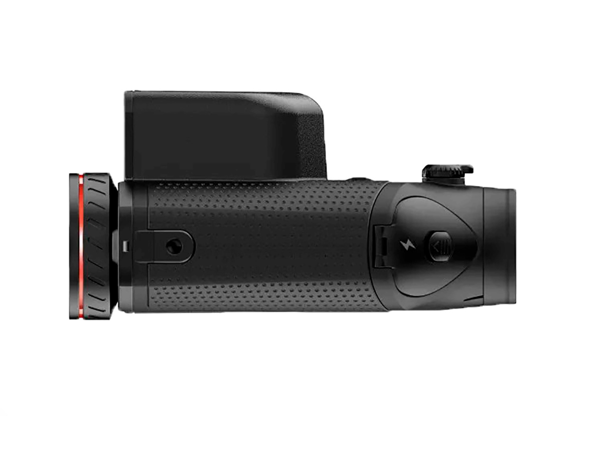 - Отличное дополнение тепловизионного монокуляра — лазерный дальномер. Дальномерный блок расположен с левой стороны корпуса и не мешает управлению прибором правой рукой. Устройство работает в режиме сканирования и однократных замеров, а дальность измерений при нормальной видимости составляет порядка 600 м.