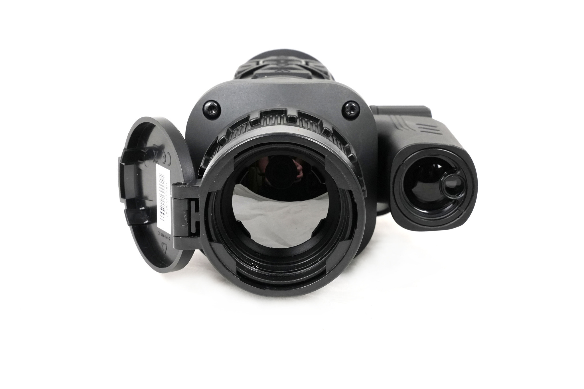 Тепловизионный прицел оснащен лазерным дальномером, способным оперативно измерять расстояния в диапазоне от 10 до 1200 метров. Излучатель и приемник находятся в одном оптическом канале, а само устройство удачно вписано в общий концепт конструкции и не мешает обзору. Дальномер работает на длинах волн 905 нм и отвечает требованиям первого класса лазерной безопасности. Погрешность измерений составляет ±1 м. Доступно 2 режима работы: одиночное измерение и режим непрерывного сканирования.