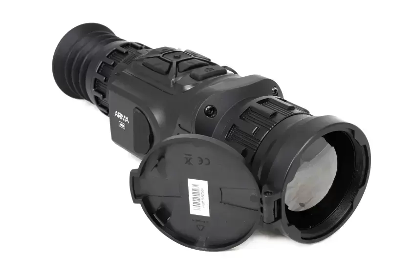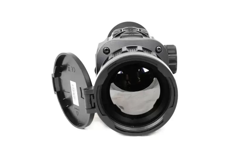 Прицел оснащен мощным германиевым объективом с фокусным расстоянием 50 мм и апертурой F1.0, обеспечивающим начальное увеличение 2,4х. Для дополнительного масштабирования изображения предусмотрена функция Digital zoom с диапазоном от 1х до 8х, что позволяет плавно или дискретно увеличить кратность до 19,2х. На минимальном увеличении угол поля зрения (FOV) составляет 8,8° × 7,0°, охватывая область пространства размером 15,4 на 12,2 метра на дистанции 100 метров. Широкий угол обзора позволяет стрелку контролировать значительное пространство и эффективно ориентироваться на местности, что особенно важно при наблюдении и стрельбе на дальних дистанциях. Резкость на нужную дистанцию настраивается с помощью низкопрофильного кольца на объективе.