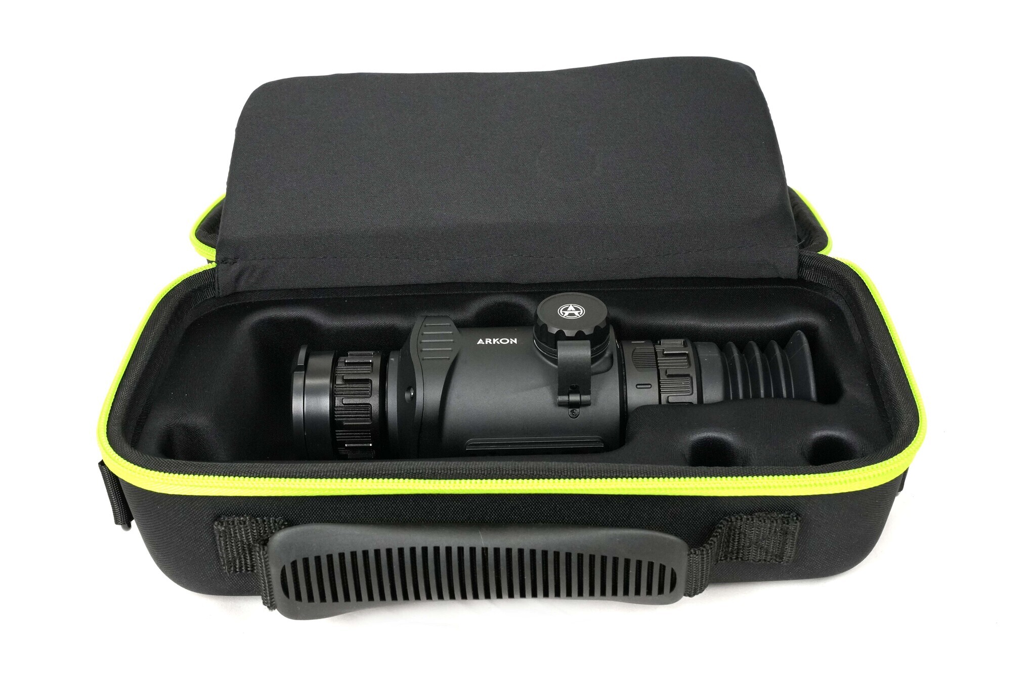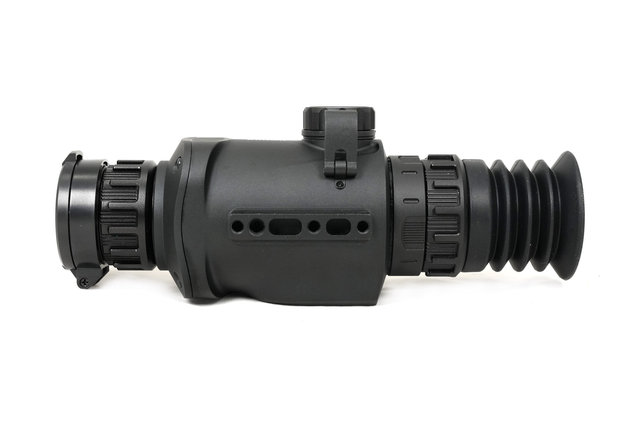 Корпус изготовлен из авиационного алюминия и защищен от влаги по стандарту IP66, что позволяет использовать его в условиях повышенной влажности. Прицел рассчитан на применение с оружием крупных калибров, таких как .375 H&H, и способен выдерживать дульную энергию выстрелов до 6 кДж. Питание прибора осуществляется от сменной батареи типа 18650 с напряжением 3,7 В, которая обеспечивает до 5 часов автономной работы. Для увеличения времени работы предусмотрена возможность подключения к внешнему источнику питания, например, Powerbank с интерфейсом 5V (USB).