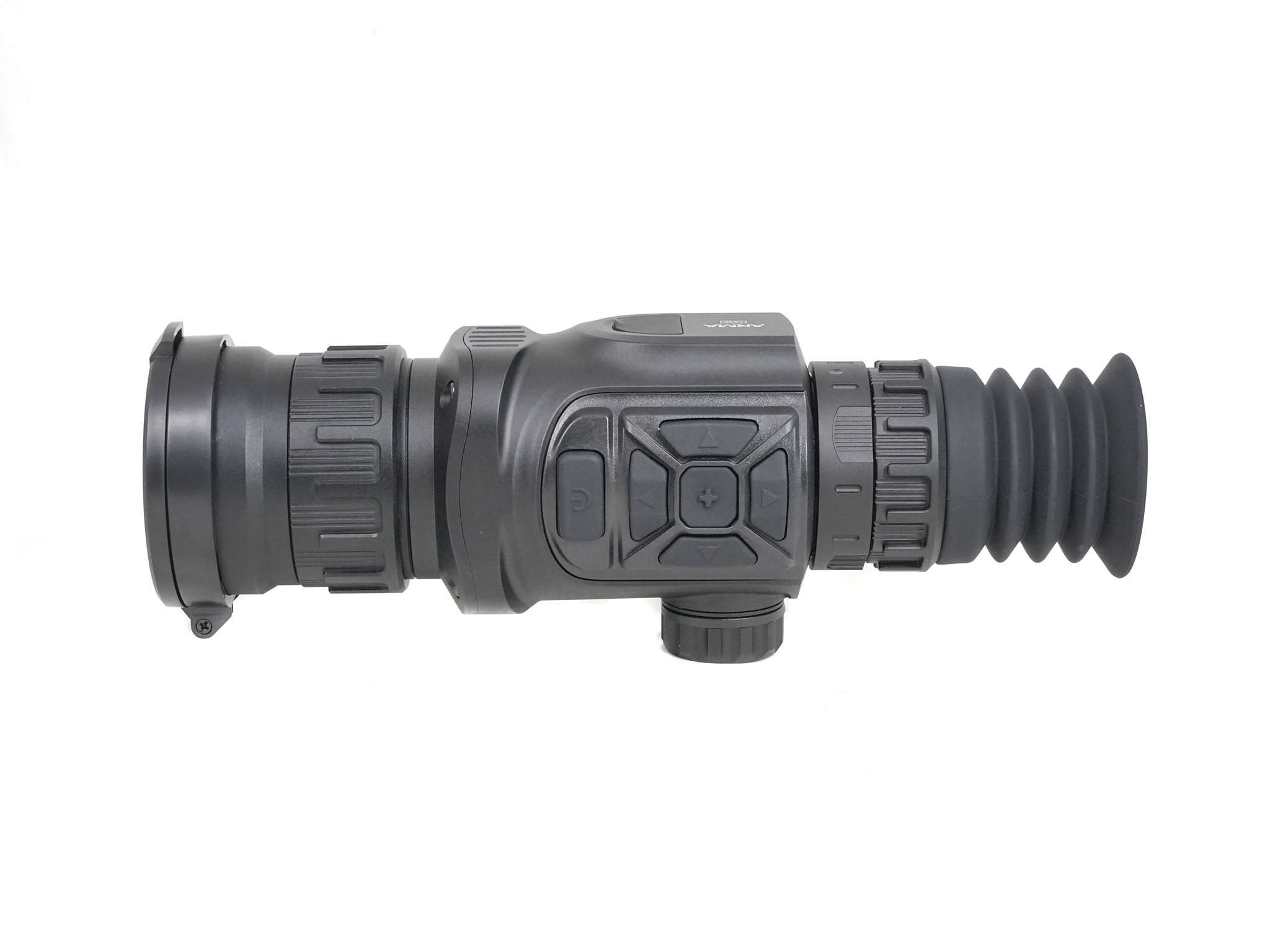 В основе оптического блока прицела лежит германиевый объектив с фокусным расстоянием 50 мм и диафрагмой F1.0. Базовый показатель кратности равен 4,4х. Для дополнительного приближения картинки используется цифровой зум с коэффициентом от 1х до 8х, в результате чего максимальная кратность может достигать 35,2х. При минимальном увеличении угол поля зрения FOV (Field of view) составляет 5,2° на 3,9°, что позволяет видеть перед собой зону пространства размером 9,1 на 6,8 метра на расстоянии 100 метров. Такие возможности оптики повышают эффективность прицеливания на больших расстояниях. Фокусировка осуществляется с помощью кольца, расположенного на корпусе объектива.
