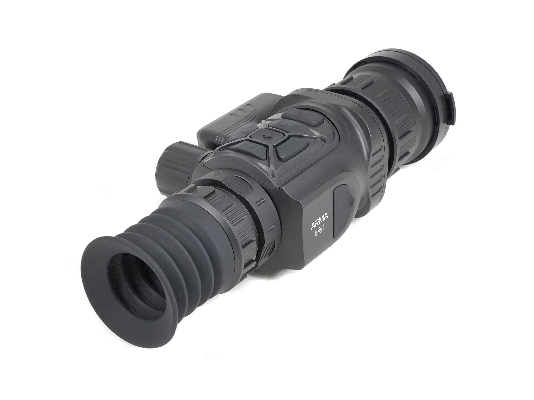 Прицел оснащен объективом из германия с фокусным расстоянием 50 мм и светосилой F1.0. Начальное увеличение равно 4,4х. Дополнительно реализована цифровая система масштабирования (Digital zoom) с диапазоном от 1х до 8х, позволяющая пошагово увеличить общую кратность до 35,2х. На минимальном зуме поле зрения FOV (Field of view) составляет 5,2° х 3,9°, что охватывает участок пространства размером 9,1 х 6,8 м на дистанции 100 метров. Широкий угол обзора способствует лучшей ориентации в пространстве, что особенно актуально при стрельбе на дальние дистанции. Настройка фокусировки осуществляется низкопрофильным кольцом на объективе.