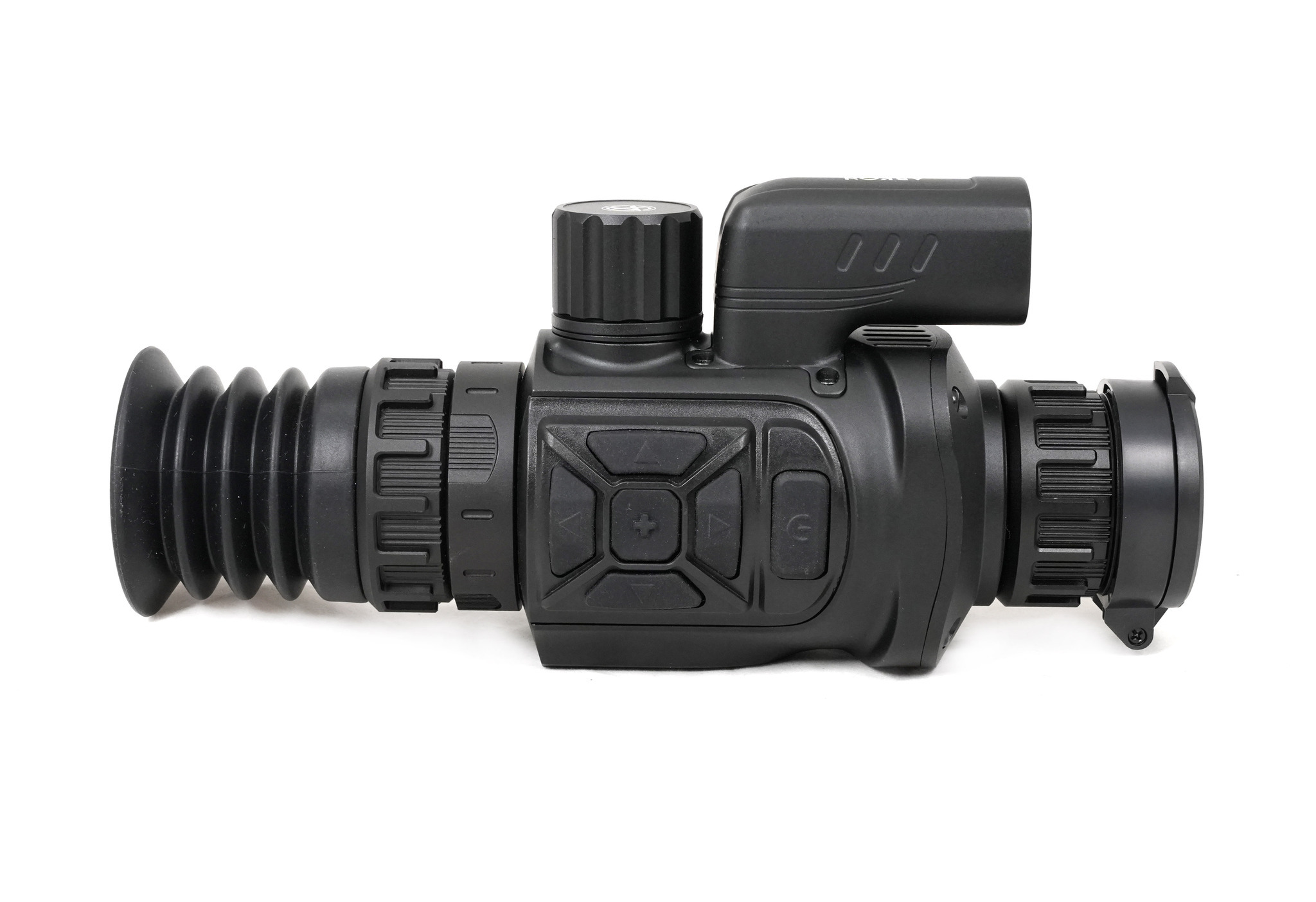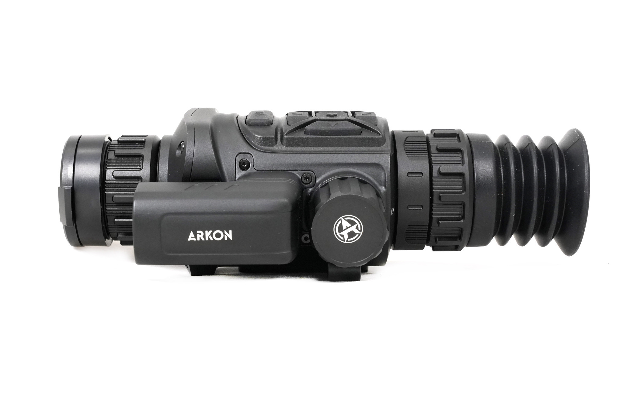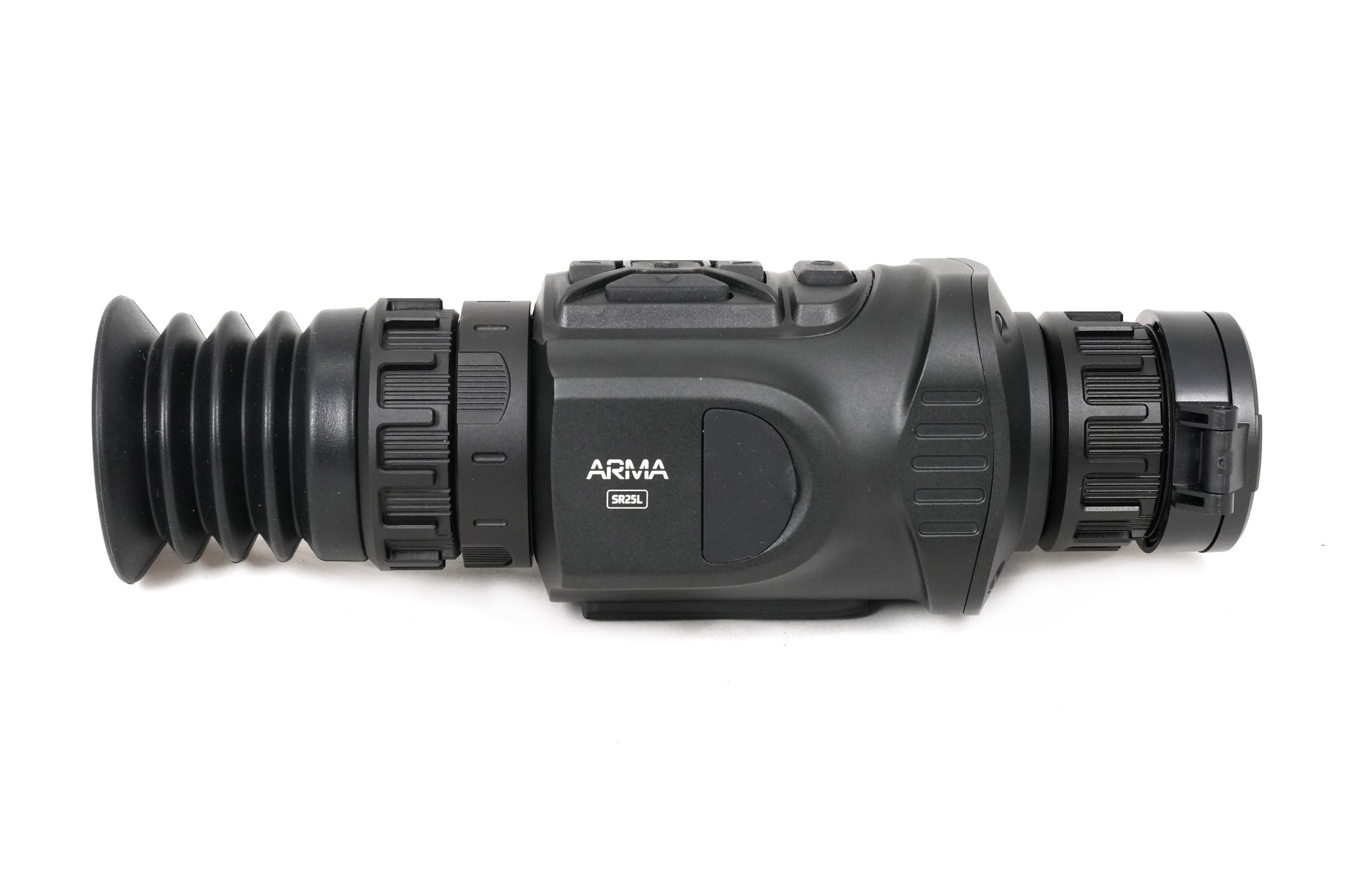 Оптический модуль Arkon Arma SR25L построен на длиннофокусном германиевом объективе 25мм/F1.0, имеющем показатель базовой кратности 3,1х. Для масштабирования изображения имеется цифровая функция Digital zoom, доступная в пределах от 1х до 4х. Благодаря этому максимальное увеличение составит 12,4х. Угол пространственного поля зрения FOV (Field of view) на минимальной кратности равен 7.0°×5.4°. В линейных размерах стрелок будет видеть перед собой область пространства размером 12,2 на 9,4 метра на удалении 100 метров. Фокусировка на дистанцию выполняется вручную, поворотом низкопрофильного кольца на объективе.