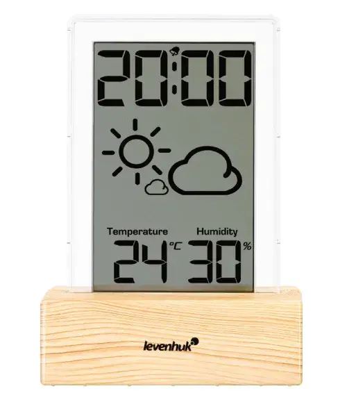 Термогигрометр Levenhuk Wezzer BASE L60 работает от батарейки и не требует подключения к сети. Настольная подставка оформлена «под дерево», кнопки управления расположены на задней панели, поэтому прибор выглядит лаконично и стильно. В верхней части экрана отображается время, под ним – метеопрогноз и результаты измерений. Есть здесь и встроенный будильник с опцией повтора сигнала через 5 минут.