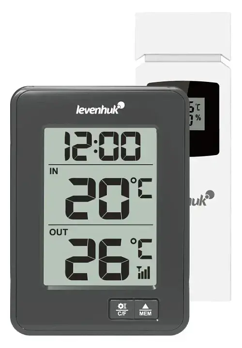 Датчик связывается с основным блоком термометра Levenhuk Wezzer BASE L50 по радиоканалу, оба прибора работают от батареек, поэтому никаких проводов для работы не требуется. Вверху экрана основного блока расположены часы, ниже – значения температуры, которые отображаются удобными для восприятия крупными цифрами. У датчика тоже есть небольшой экран, благодаря чему узнать результаты его измерений можно прямо в месте установки. Кроме температуры, датчик измеряет и выводит на свой экран еще один параметр – влажность воздуха на улице.