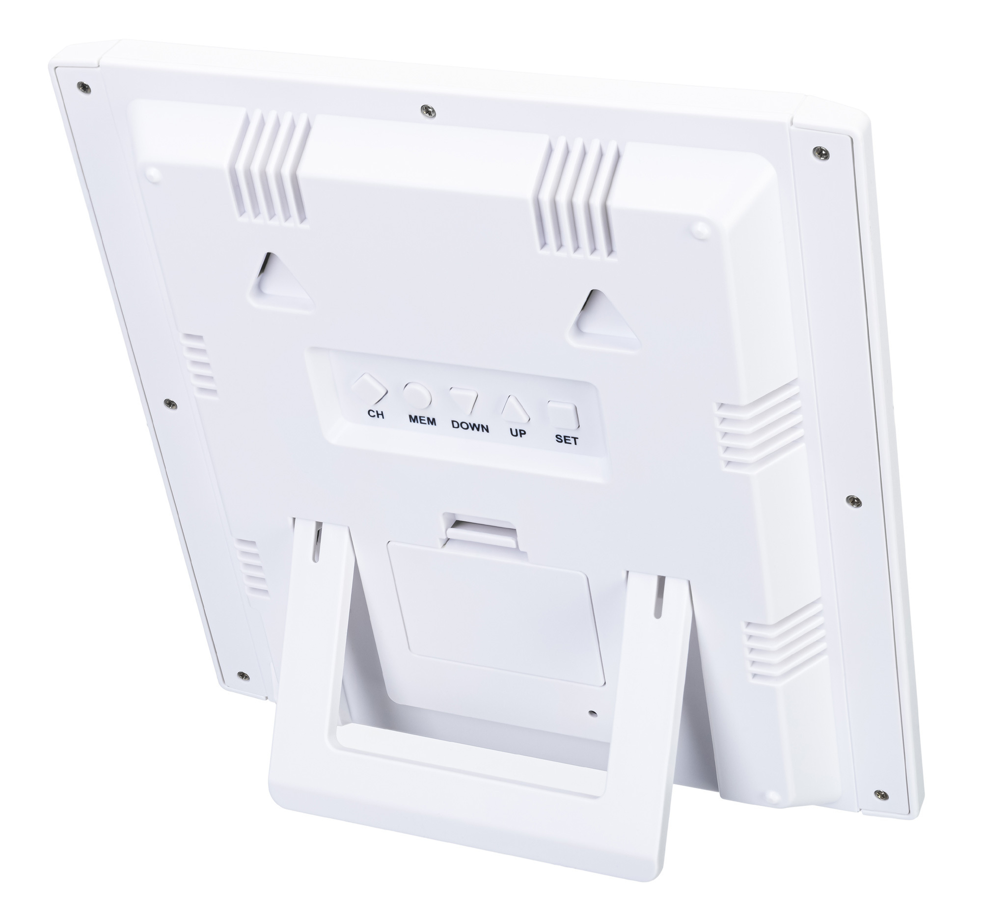 Основной блок оснащен складной настольной подставкой, а датчик – настенным креплением. Кнопки управления находятся на задней панели термометра, проводного подключения не требуется, поэтому во внешнем облике прибора нет ничего лишнего.
