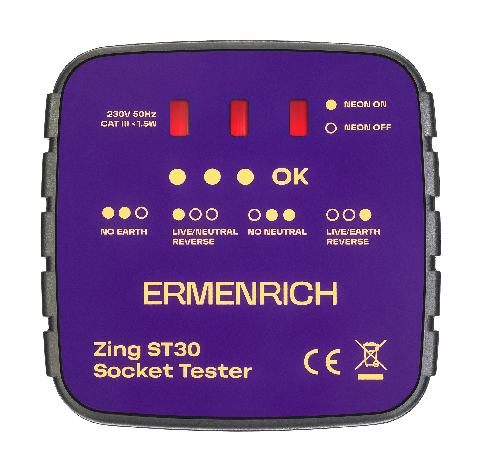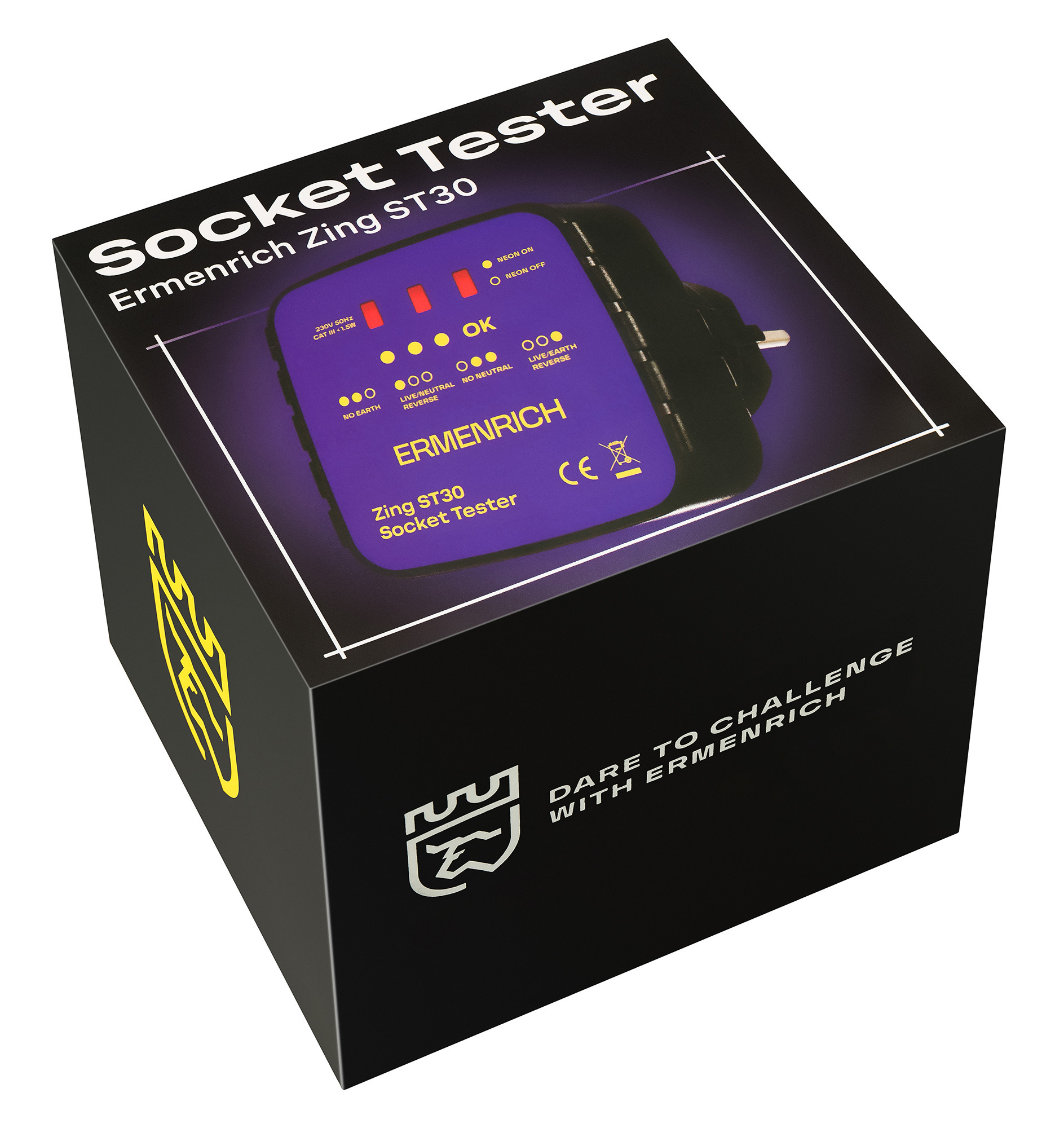 Тестер розеток Ermenrich Zing ST30 – прибор, который нужен, чтобы контролировать правильность установки розеток и проверять наличие электропитания в сети. Для начала работы прибор требуется установить непосредственно в розетку. На торце появится световой код – один из пяти, который укажет, все ли верно или есть нарушения: перепутанные фаза и земля или фаза и ноль, обрыв ноля или земли. Описание световых кодов приведено на самом приборе.