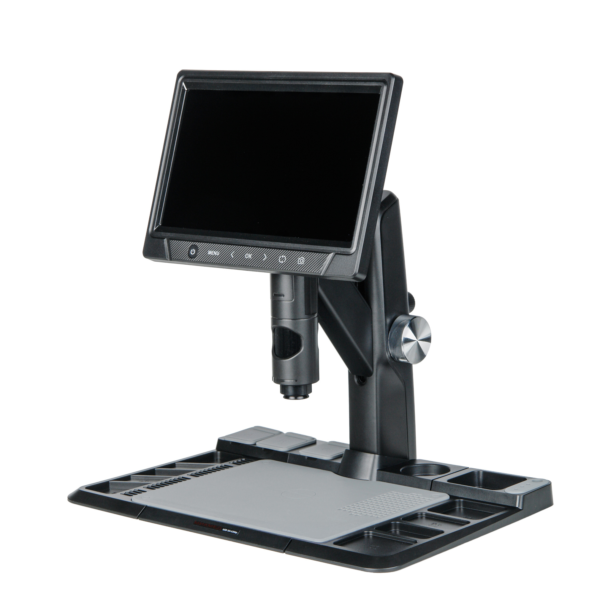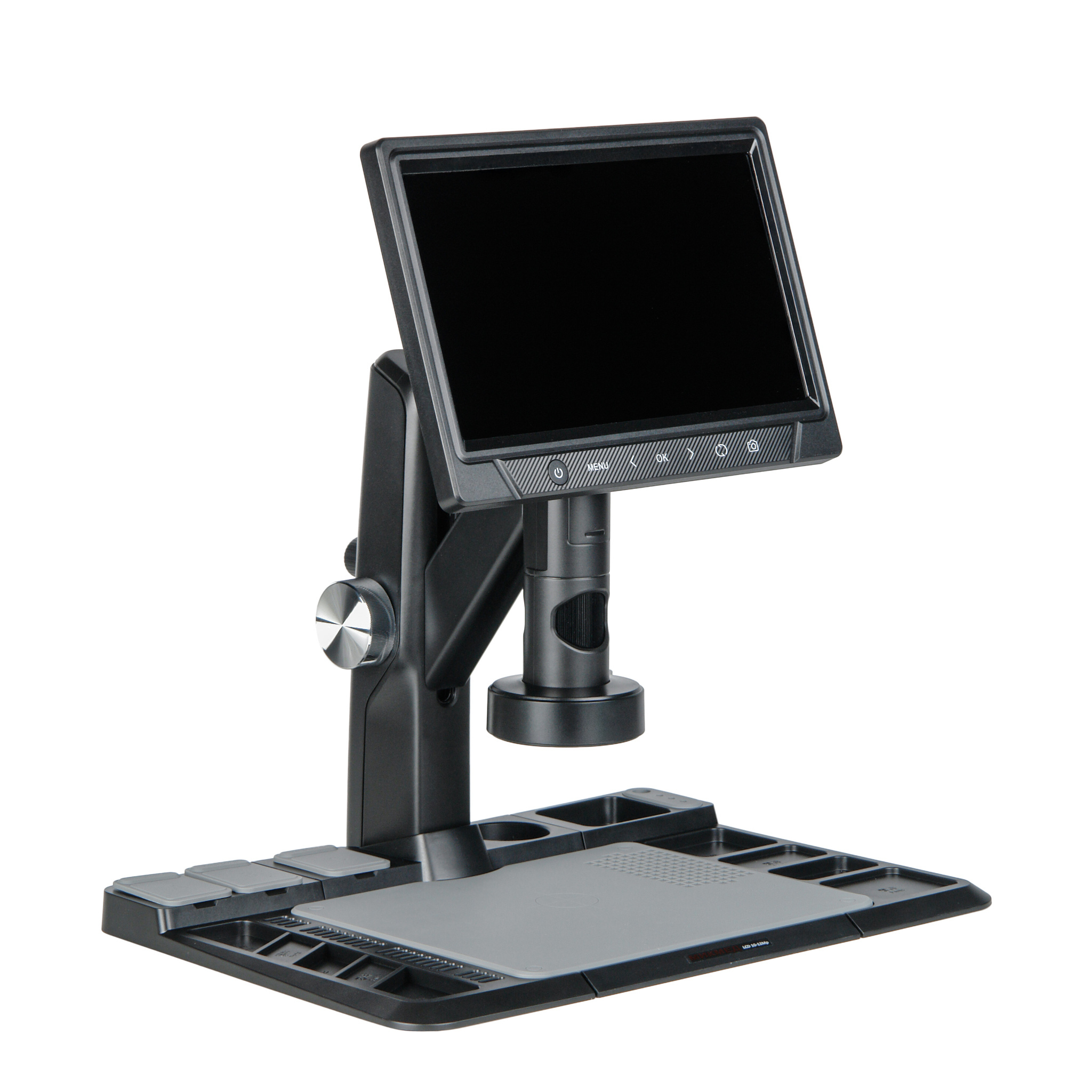 В микроскопе используется монитор формата 16:9 с диагональю 10.1 дюймов на IPS матрице с разрешением 1024х600 точек. Применение жидкокристаллической матрицы c технологией IPS позволяет наблюдать отчетливое изображение с углами обзора до 170 град. без затемнения, что позволяет участвовать в исследованиях нескольким лицам и проводить наблюдения с комфортом и без чрезмерного напряжения. Монитор обеспечивает высокую яркость, контрастность и точное воспроизведение цветов изображения. На корпусе монитора расположены кнопки всех основных настроек, слот для карты памяти и интерфейсы USB2.0 и USB Type С.