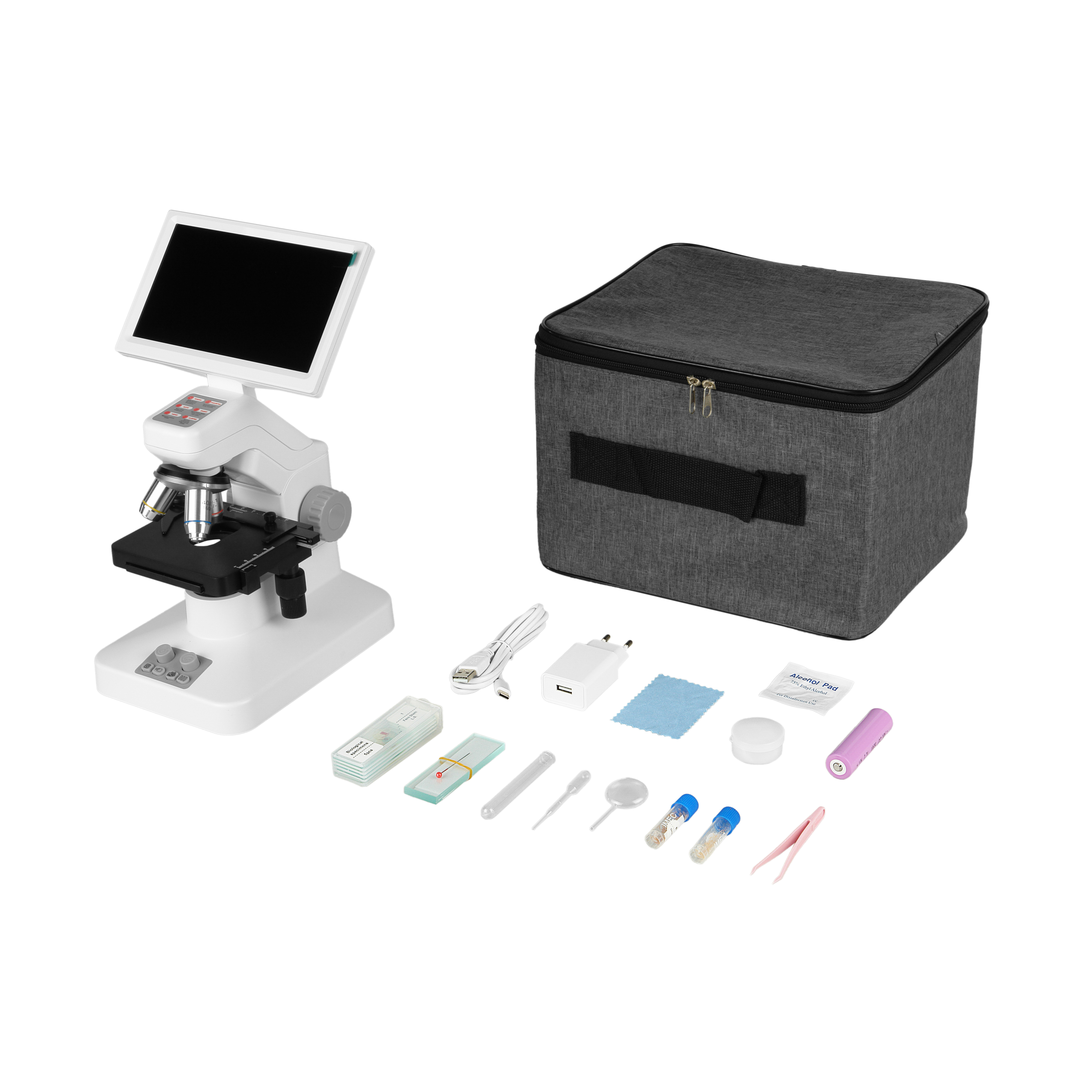 Встроенная 3Мр камеры и IPS монитора 7” позволяют в режиме реального времени и без чрезмерного напряжения глаз наблюдать изображение на мониторе микроскопа без подключения к ПК. Жидкокристаллическая матрица c технологией IPS позволяет наблюдать отчетливое изображение с углами обзора до 170⁰ без затемнения, это позволяет проводить с комфортом групповые занятия.