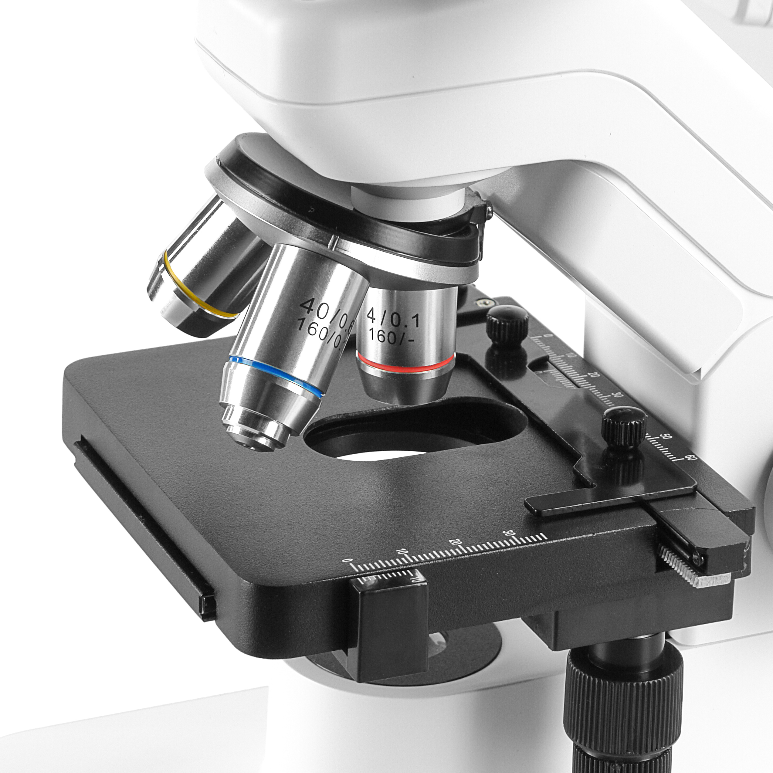 В комплекте микроскопа три объектива высокого разрешения 4х, 10х и 40х позволяющие получать резкое изображение с правильной цветопередачей и минимальными искажениями. Линзы объективов изготовлены высококачественных оптических стекол, объектив 40х оснащен подпружиненной оправой для предотвращения повреждения объектива и образца при фокусировке. Все объективы установлены на револьверном устройстве, позволяющем быстро переходить к различным увеличениям.