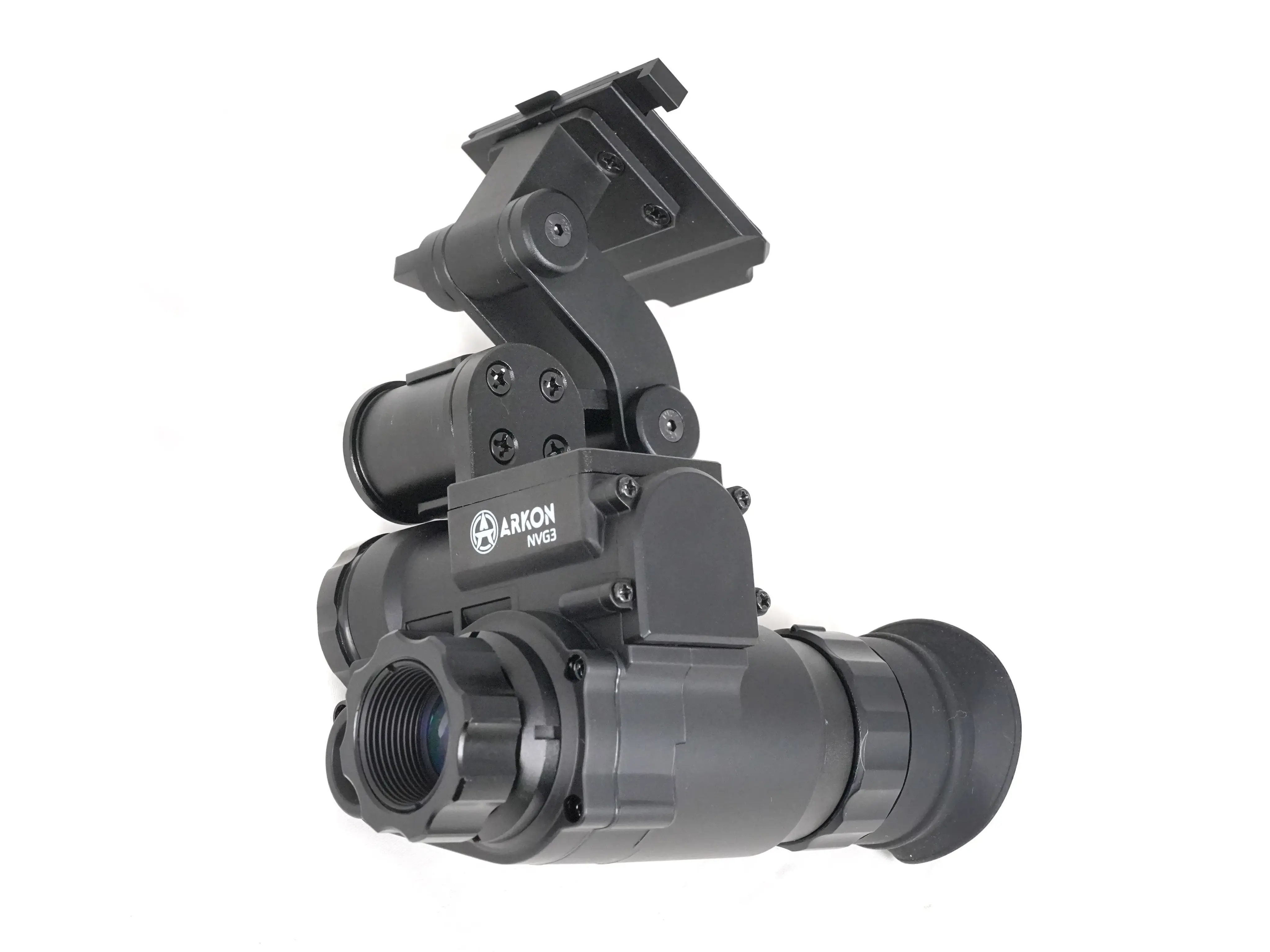 Arkon NVG3 использует оптический модуль с объективом, диаметр которого равен 17,5 мм и имеет начальное увеличение 1х, что исключает искажения размеров объектов и обеспечивает оператору естественное восприятие сцены. Для детального изучения целей предусмотрен цифровой зум 1х–3х. Поле зрения FOV (Field of view) оптического модуля равно 25,5° х 14,5°, что в линейных размерах соответствует видимой области пространства 45,3 на 25,4 м на удалении 100 м. Механизм фокусировки расположен на объективе и оснащен низкопрофильным кольцом с глубокой насечкой, удобным при работе в перчатках. Окуляр оснащен кольцом диоптрийной подстройки, доступной в пределах от +2 до -5 дптр.