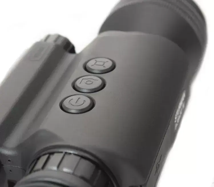 Комбинированная система управления. Для быстрой настройки сверху на корпусе есть 3 «горячие» кнопки — для включения/выключения прибора и изменения яркости подсветки, записи фото / видео и выбора режима наблюдения (цветной, зелёный, чёрно-белый). А с помощью энкодера, расположенного на торце батарейного отсека, можно получить доступ к основному Меню и всем встроенным функциям.