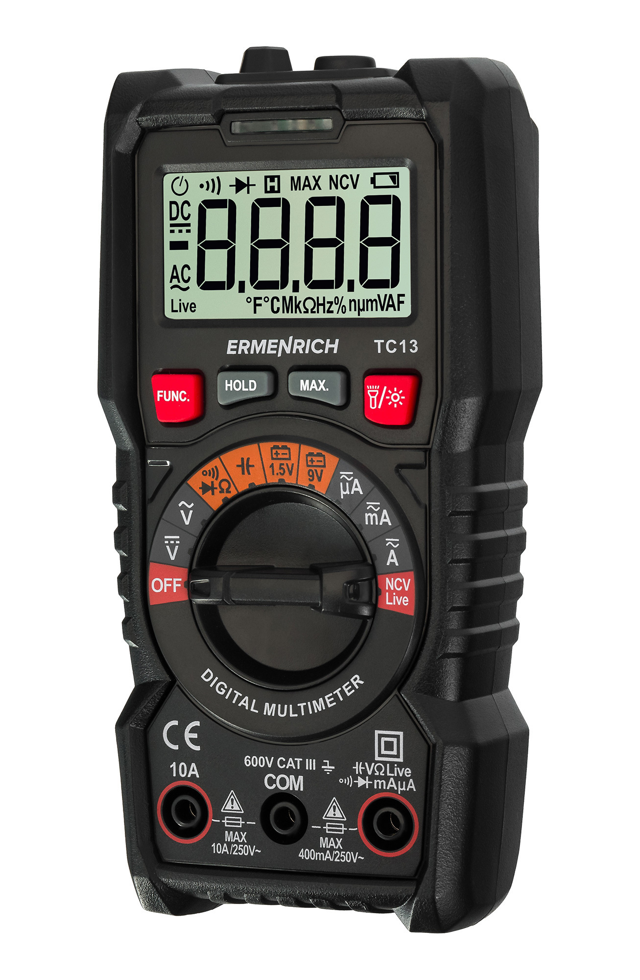 Ermenrich Zing TC13 – портативный цифровой измеритель для измерения силы тока, напряжения и сопротивления, а также частоты, емкости и рабочего цикла. Кроме того, с его помощью можно определять обрывы и пробои диодов, короткое замыкание, обрыв кабеля. Есть функция бесконтактного обнаружения скрытой проводки под напряжением. Мультиметр оснащен ЖК-дисплеем для отображения режимов работы и результатов измерений.