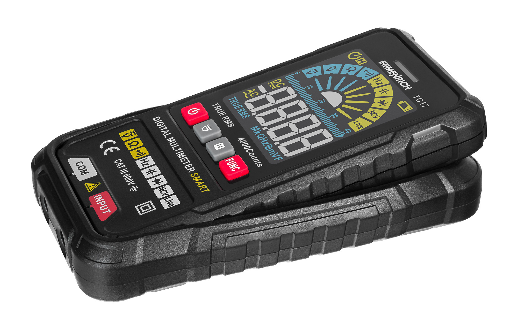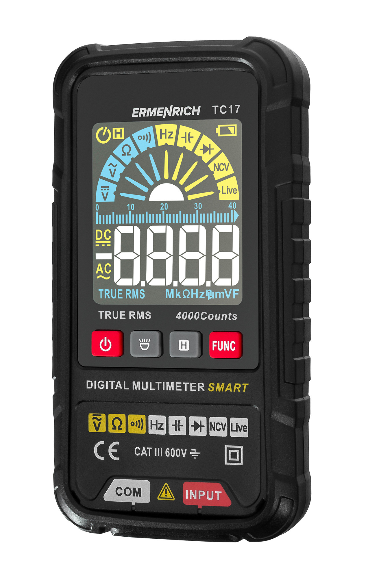 Мультиметр Ermenrich Zing TC17 оснащен цветным ЖК-дисплеем с графическими обозначениями функций. Управление осуществляется с помощью 4 кнопок, расположенных под экраном. Прибор работает от сменных батареек типа AAA (не входят в комплект). Если устройством не пользуются, оно автоматически отключается и не расходует заряд. Текущий уровень заряда отображается на дисплее.