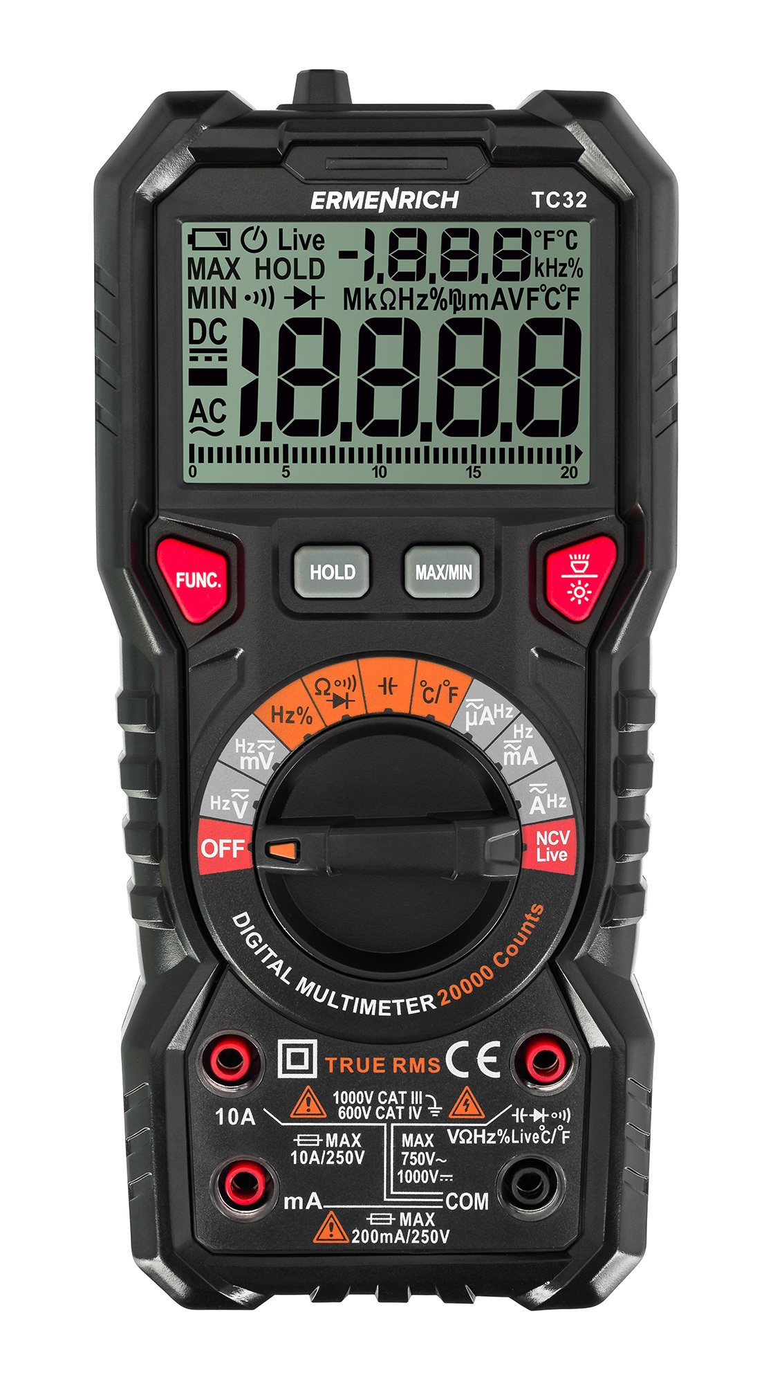 Перед вами Ermenrich Zing TC32 – компактный цифровой измеритель для определения нескольких электрических характеристик: напряжения, сопротивления, силы тока, емкости, частоты, рабочего цикла. С помощью мультиметра также можно измерять температуру в °C или в °F. Кроме этого, в приборе есть функции тестирования диодов на пробои и обрывы, определения фазы, поиска короткого замыкания, бесконтактного выявления скрытой проводки под напряжением (NCV). Измерения осуществляются по методу среднеквадратичных значений (True RMS), результаты отличаются высокой точностью.