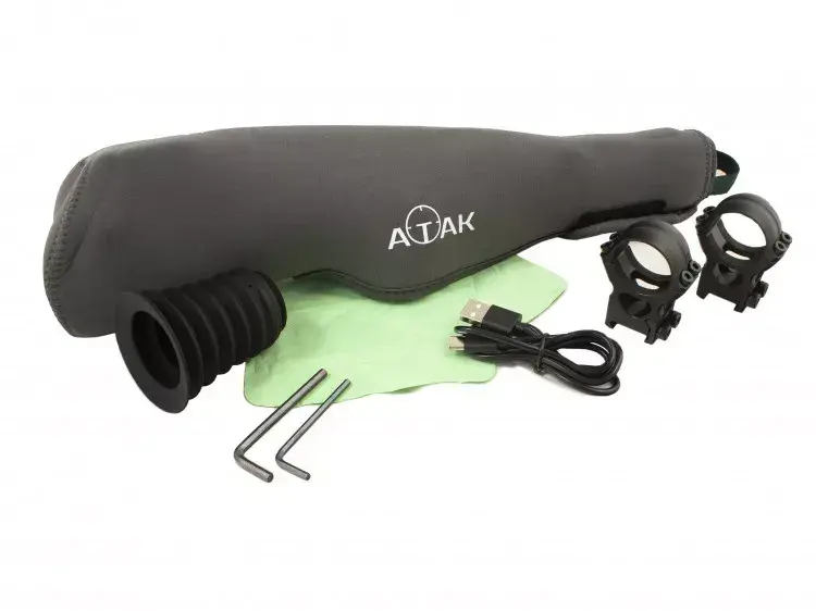 Прибор ATAK ES3T-LRF (70-940) является цифровой камерой, регистрирующей излучение в видимой и инфракрасной части спектра 400...900 нм и выполненной в виде прицела. Может быть установлен на охотничье оружие для выполнения прицеливания и ведения наблюдений в ночное и дневное время суток в указанном спектре. Способен записывать фото и видео со звуком на съемную карту памяти и передавать видеосигнал по Wi-Fi, HDMI и USB-кабелю.