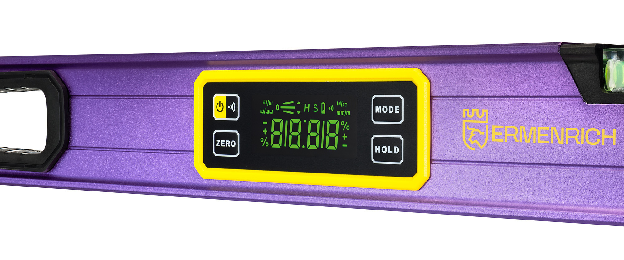 Цифровой уровень Ermenrich Verk LL100 – это высокоточный и простой в обращении прибор, который подойдет как для профессиональной деятельности, так и для использования в быту. Он сочетает в себе угломер, отвес и ватерпас и станет незаменимым помощником на строительных и монтажных работах, а также на производстве. Прибор быстро и с минимальной погрешностью (±0,1° для вертикалей и горизонталей и ±0,2° при произвольных углах) определяет значения углов и обладает рядом полезных дополнительных функций: установка на ноль, удержание значений и т. д.