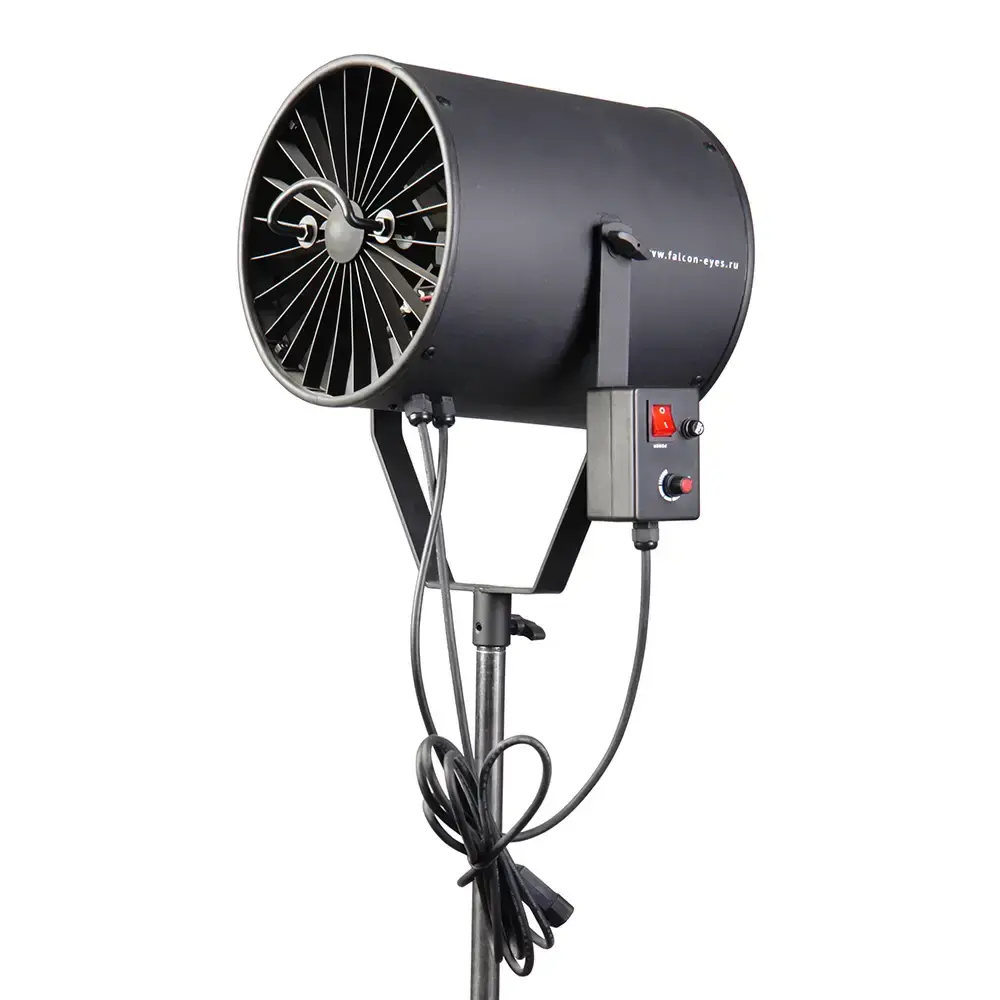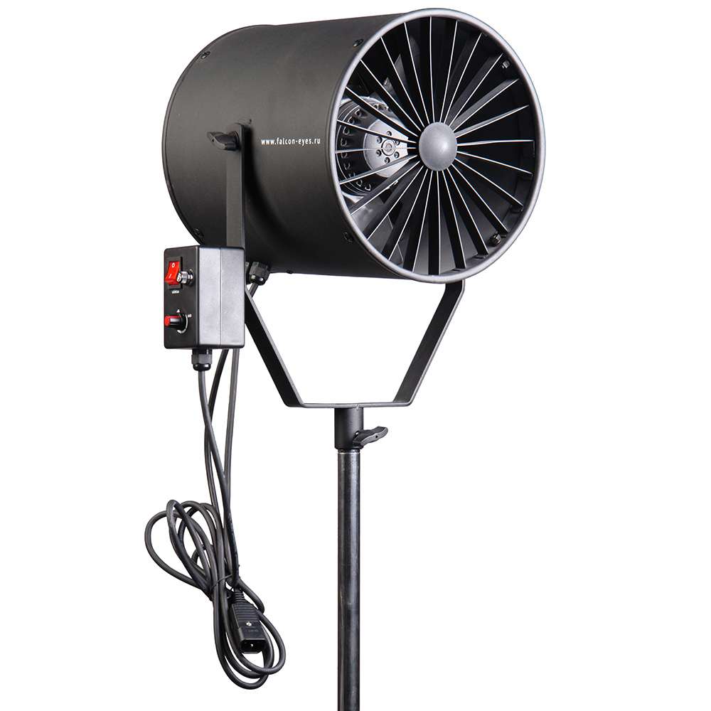 Профессиональный мощный студийный вентилятор осевого (аксиального) типа, который позволит получить поток воздуха необходимой интенсивности. С помощью него в кадре можно имитировать как легкое дуновение морского бриза, так и настоящий ураган, регулятор скорости вращения лопастей плавно меняет скорость воздушного потока. Эффект работы данного вентилятора добавляет кадру динамичность.
