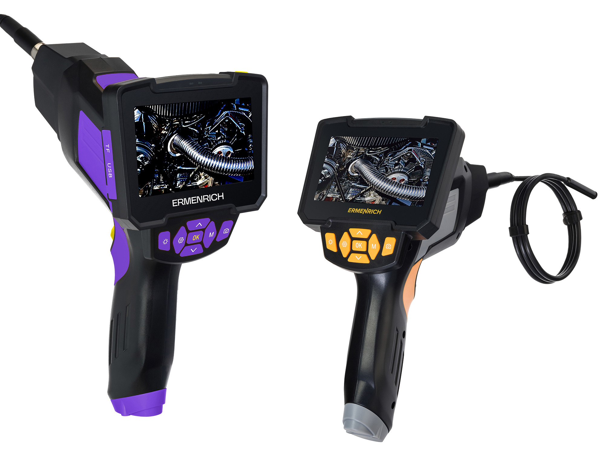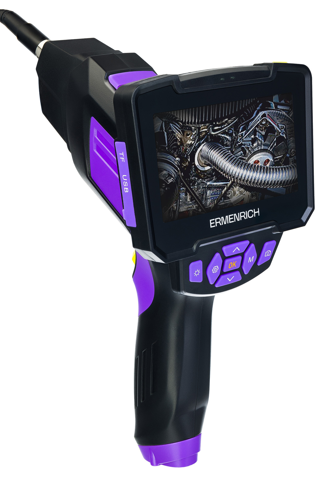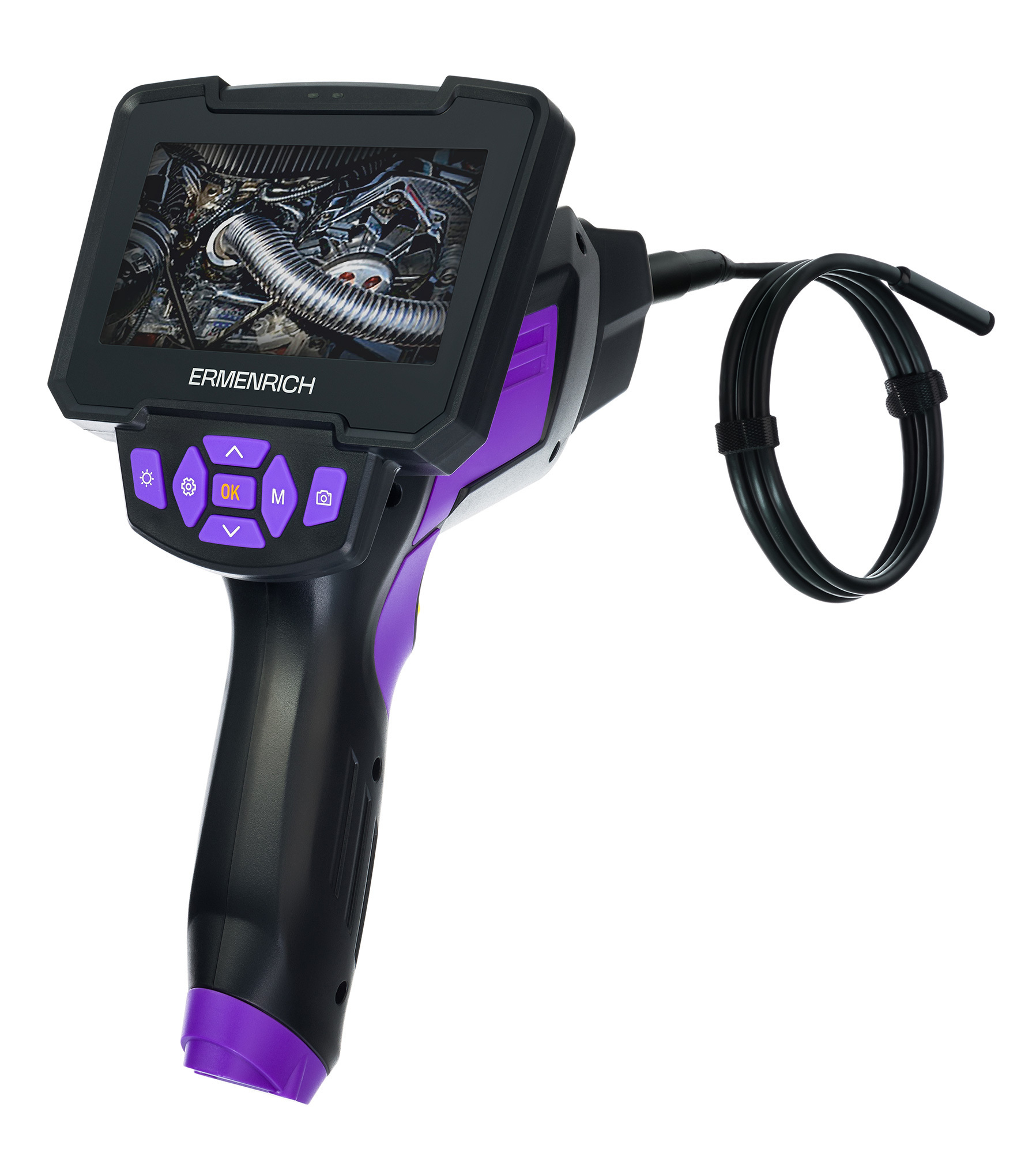 Устройство для осмотра трудноступных мест трубопроводов, кабельных линий, промышленного оборудования. Бороскоп Ermenrich Seek VE60 оснащен полужестким кабелем длиной 1 м и цветным дисплеем с диагональю 4,3". У этой модели две камеры – одна фронтальная и одна боковая – для съемки фото (разрешение 1280x720 пикс) и видео (640x480 пикс). Камера имеет угол обзора 70° и дает четкое изображение благодаря светодиодной подсветке. Степень герметичности камеры IP67, ее можно погружать в воду.