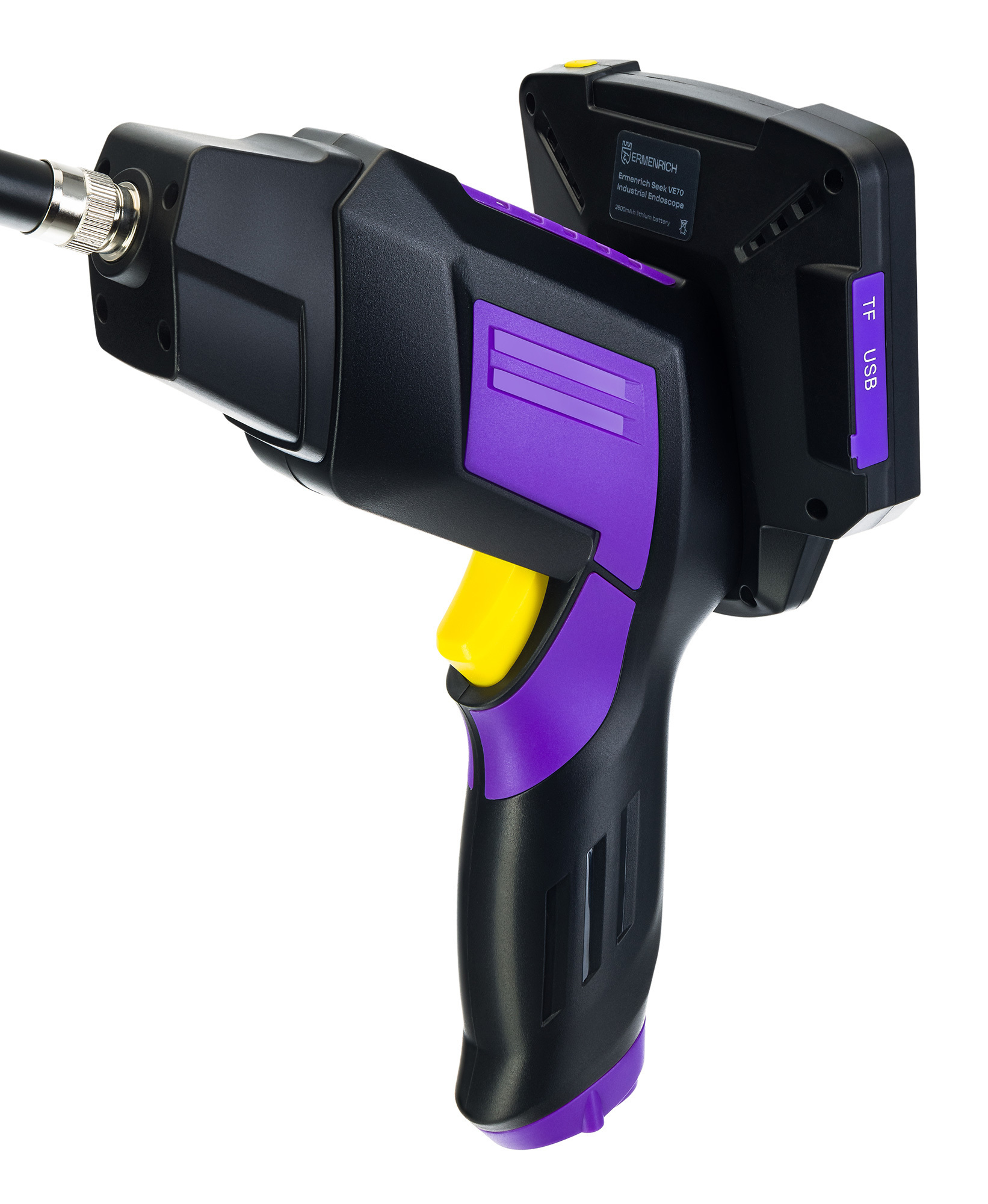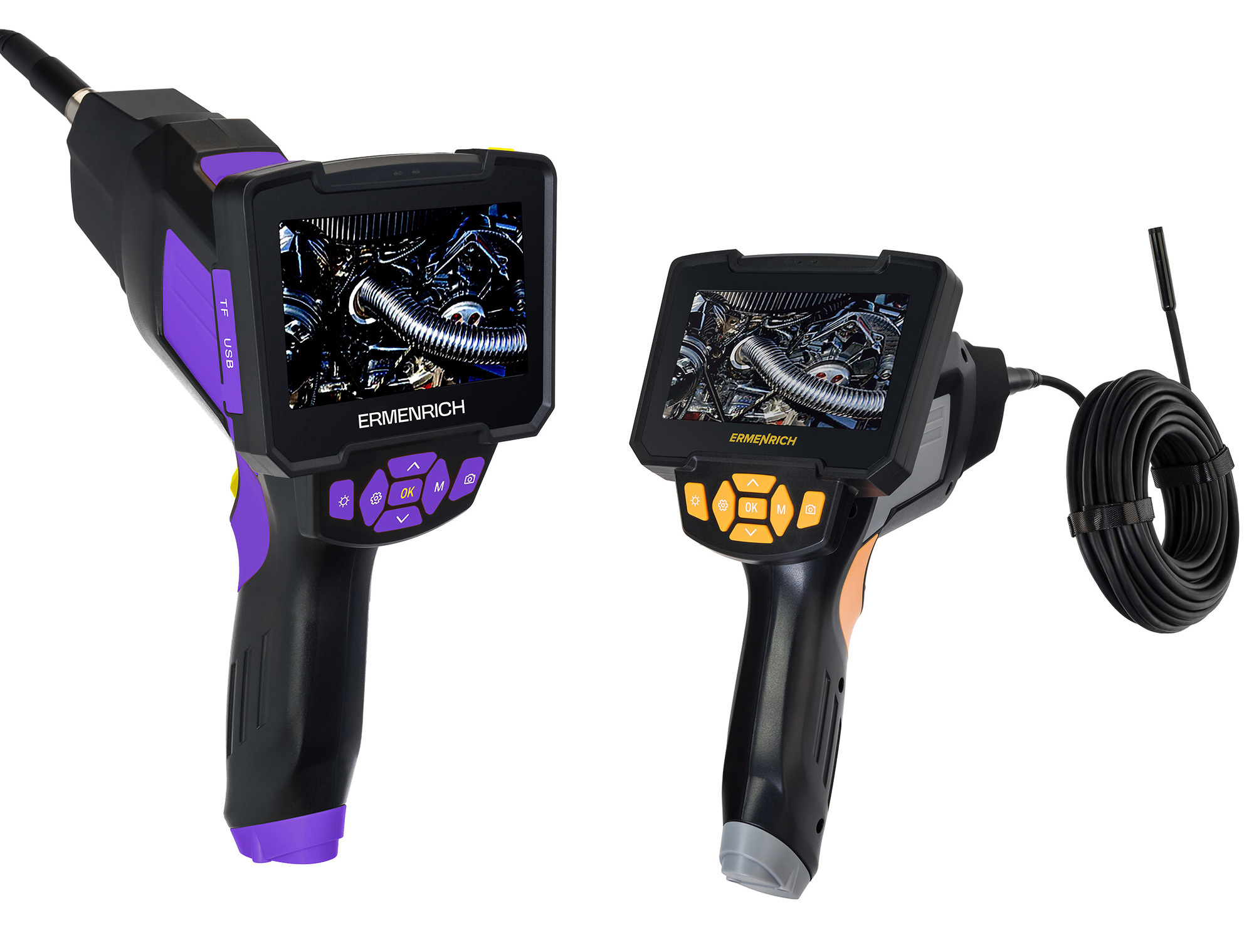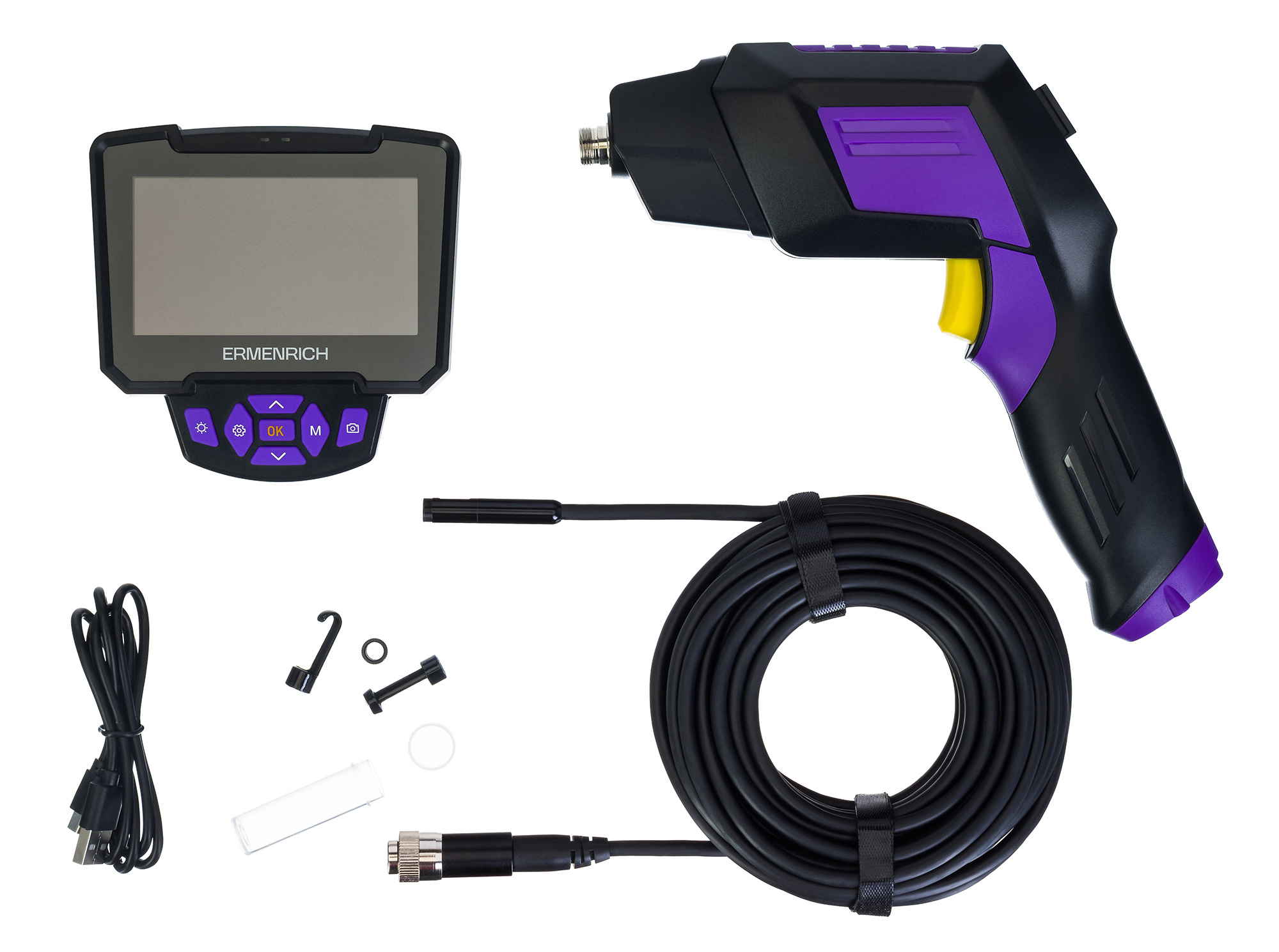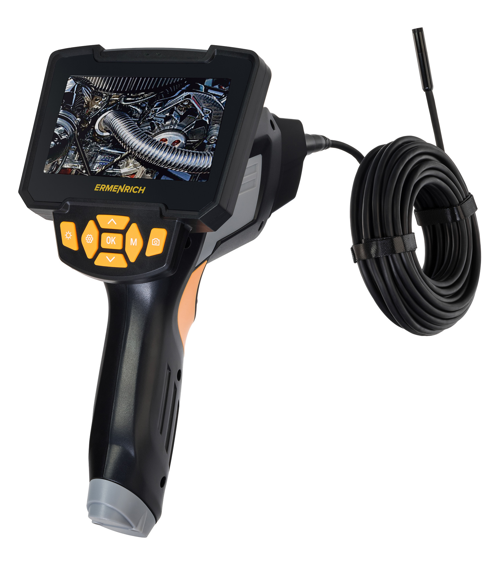 Бороскоп Ermenrich Seek VE70 с полужестким кабелем длиной 10 м и с двумя камерами высокого разрешения – фронтальной диаметром 8 мм и боковой диаметром 4,5 мм. Тонкий кабель длиной 10 м можно быстро завести в труднодоступное место, например, при ремонте трубопровода или автомобильного двигателя. Обе камеры имеют светодиодную подсветку, угол обзора составляет 70°. Степень защиты камер и ламп подсветки IP67, поэтому их можно использовать даже под водой (в течение небольшого времени).