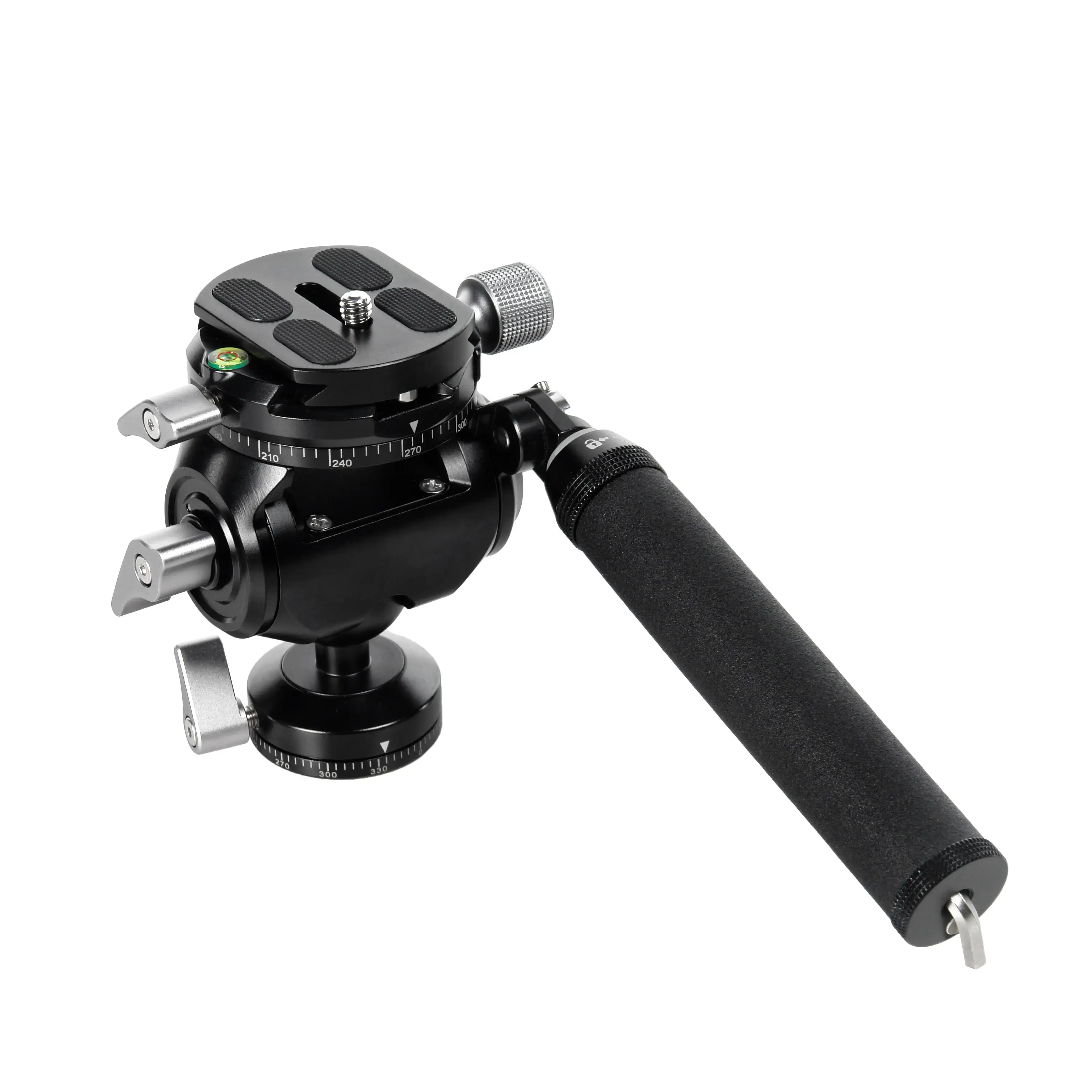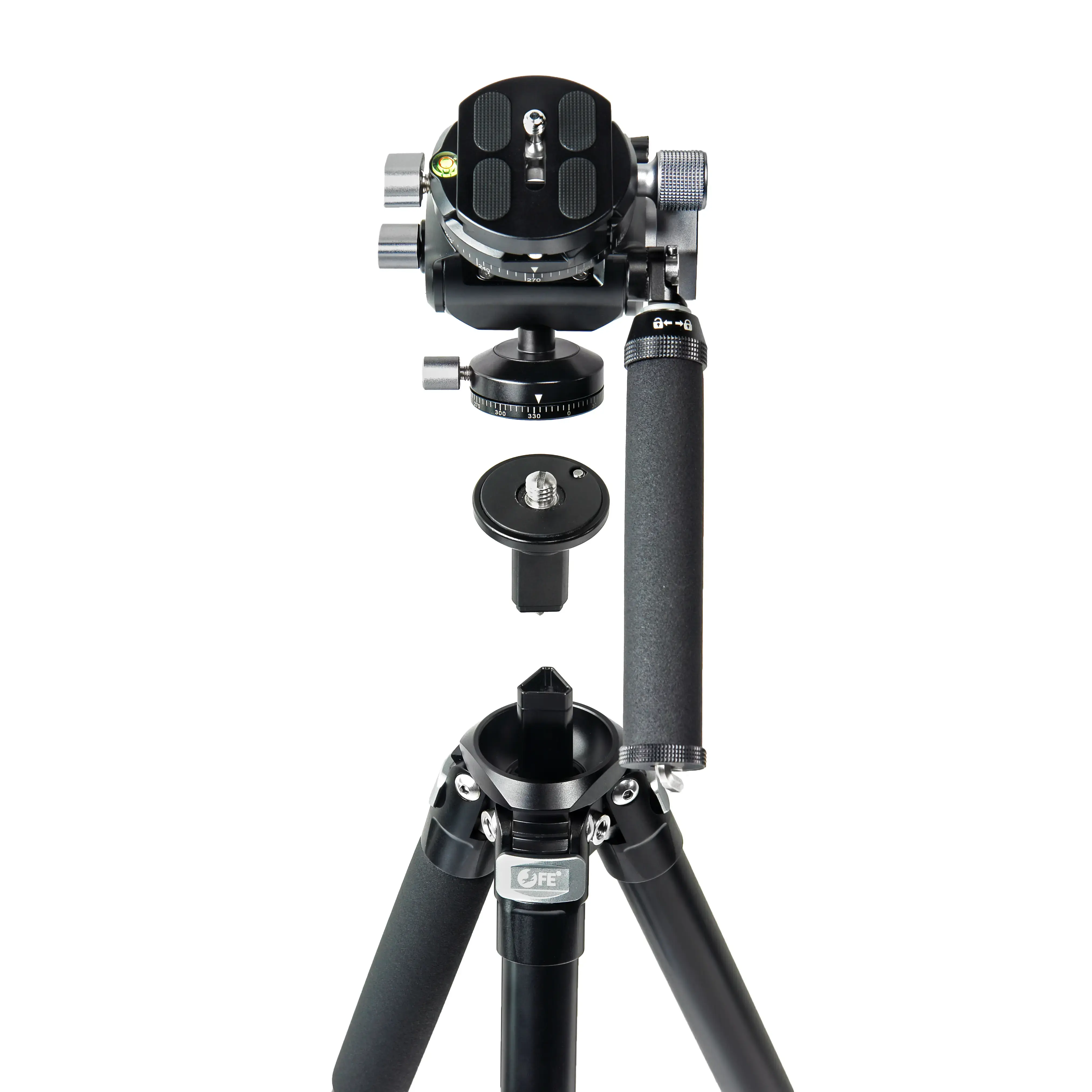 Съемная телескопическая рукоятка длиной 22-30 см может быть установлена с разных сторон головки, чтобы штативом было удобно пользоваться как правой, так и левой рукой.