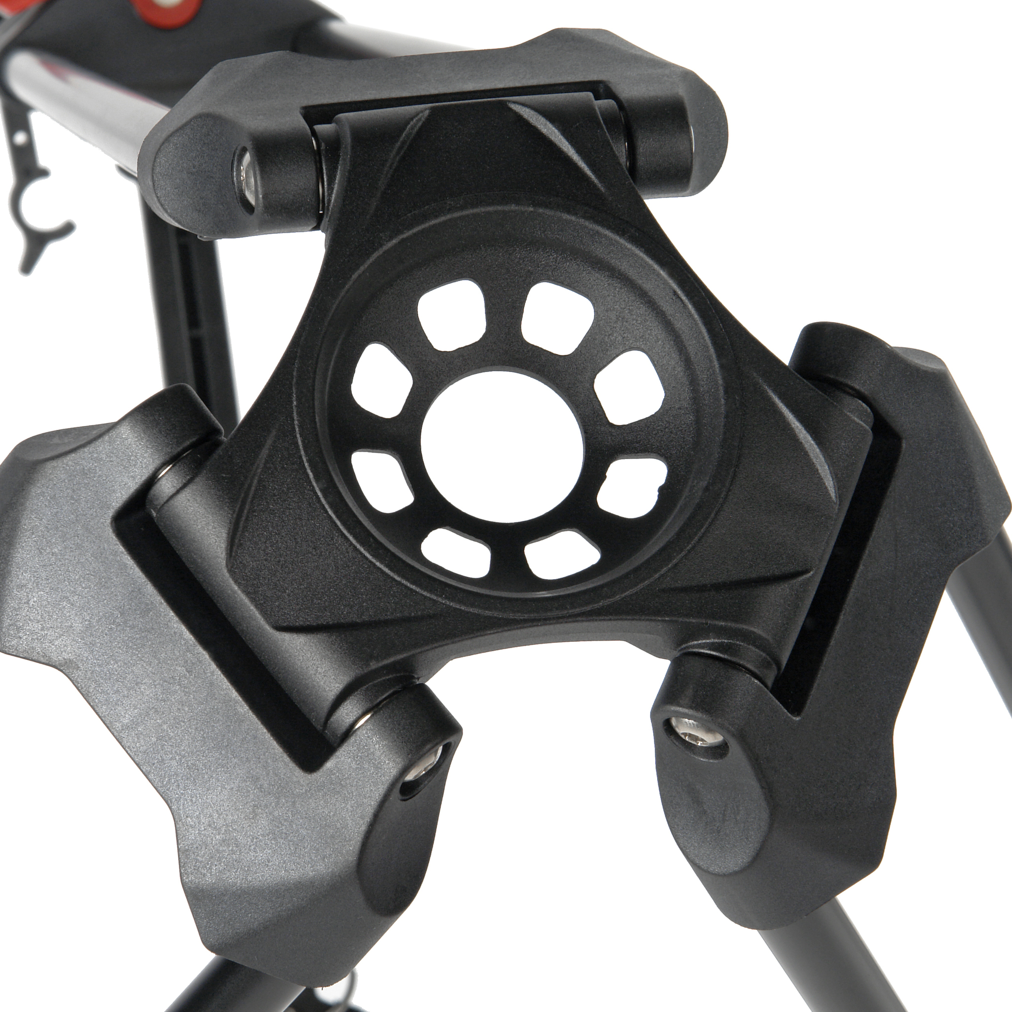 Ножки штатива вилочного типа. Секции ног надежно фиксируются клипсовыми замками. При ослаблении клипсового фиксатора — возможна регулировка зажима винтом с обратной стороны клипсы. Шестигранные ключи для регулировки в комплекте.