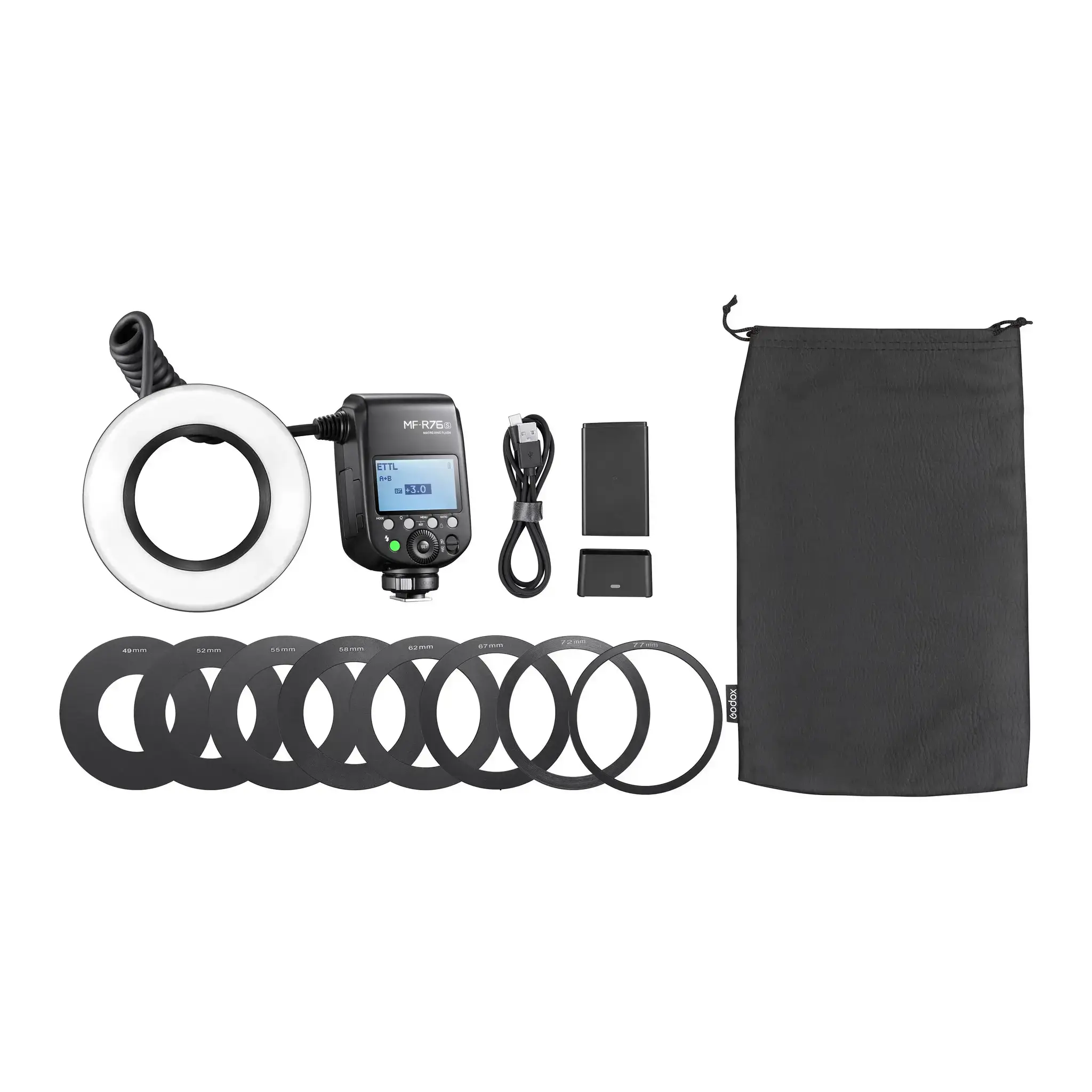 MF-R76 - мобильный источник света для создания равномерного бестеневого освещения. Макровспышка состоит из двух компонентов: контроллера, который вставляется в крепление «горячий башмак» DLSR-камеры, и кольцевой вспышки, которая крепится к объективу.