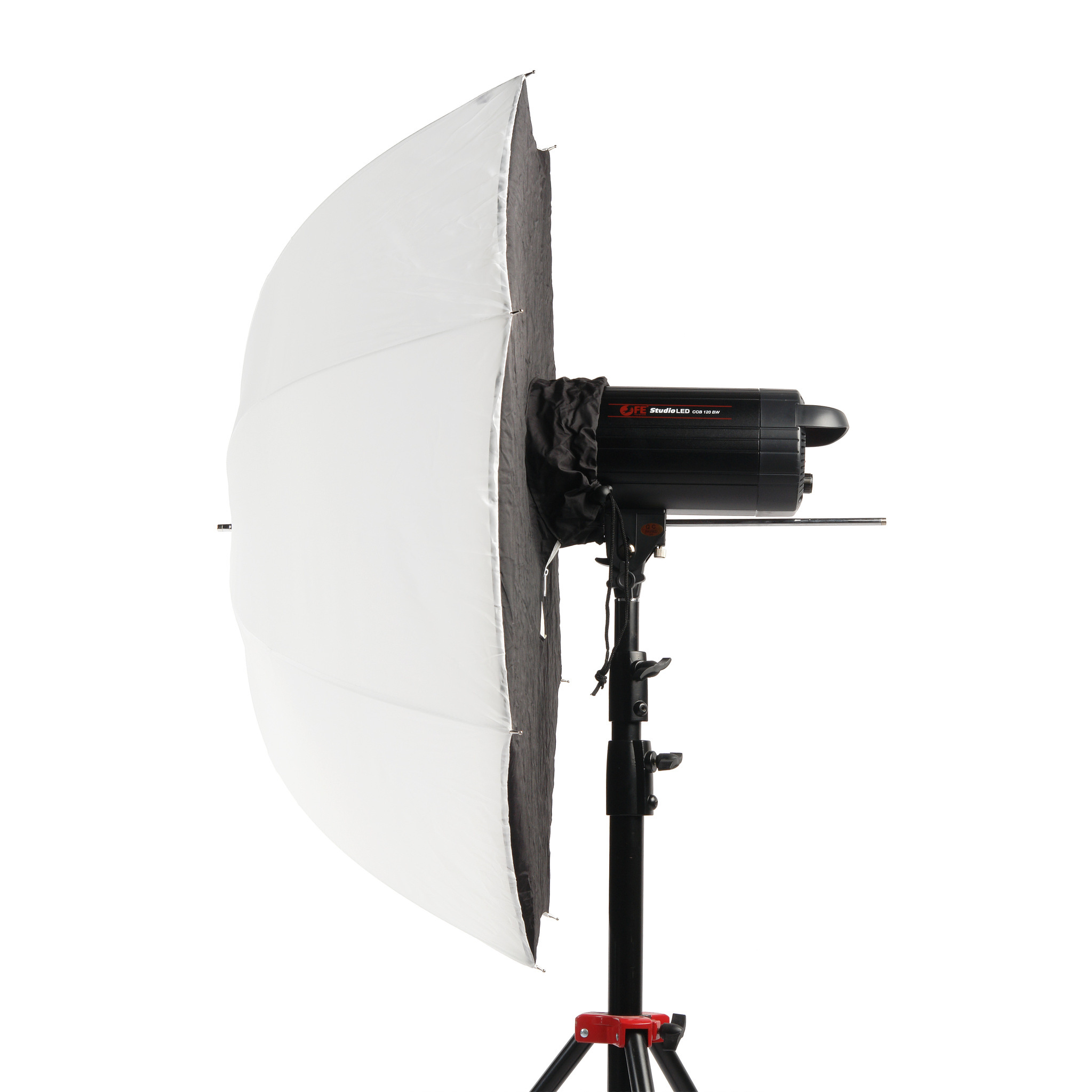 Зонт весом всего 380 г упаковывается в компактный чехол размером 72х15х9 см. Зонт можно легко использовать в студии (даже в качестве софтбокса) или взять с собой на плэнерную съемку.